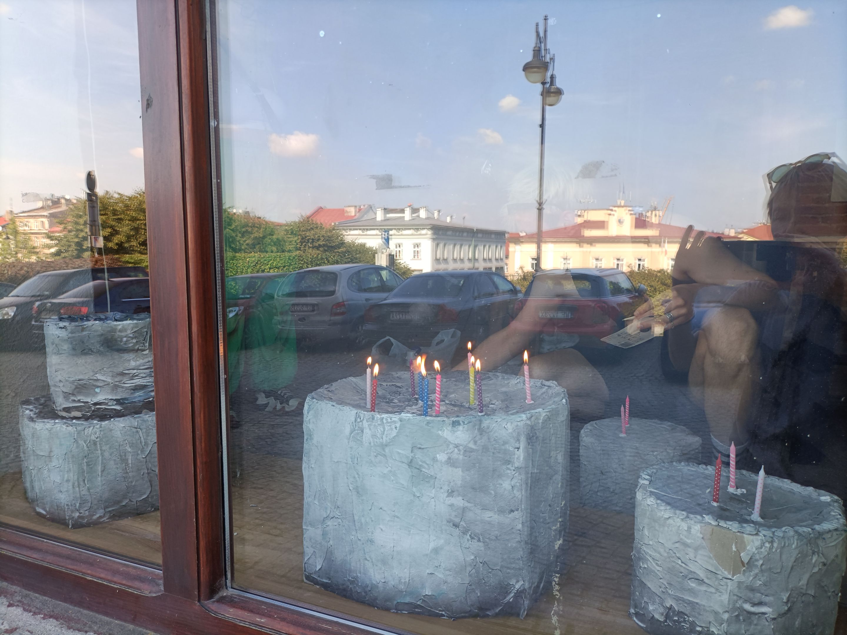 Torty Patryka Brzezickiego w witrynie lokalu Stowarzyszenia Most, fot. J. Sawicka -