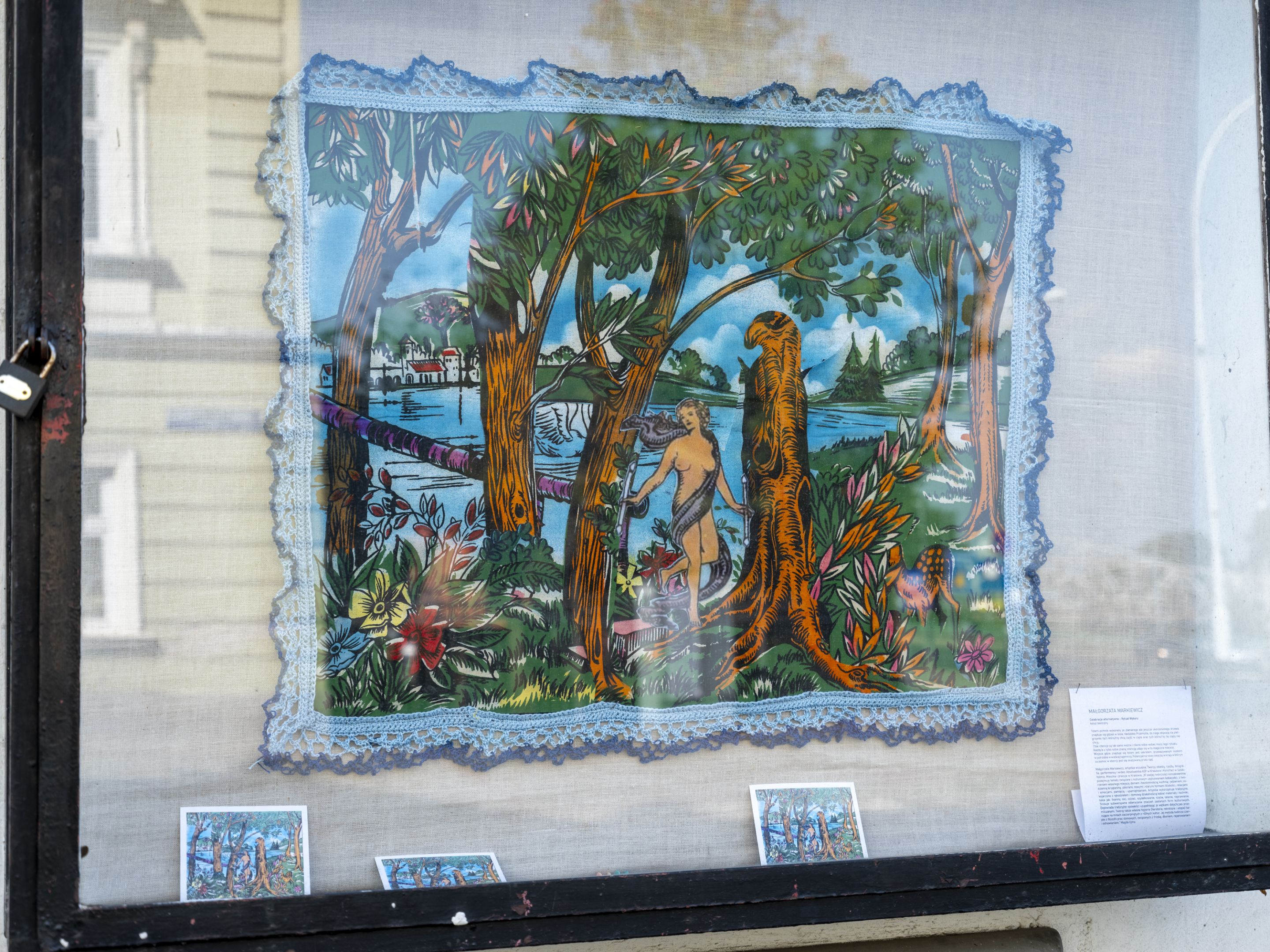 Małgorzata Markiewicz, Rytuał wyboru, kolaż tekstylny w gablocie Towarzystwa Przyjaciół Nauk w Przemyślu, fot. M.Horwat -