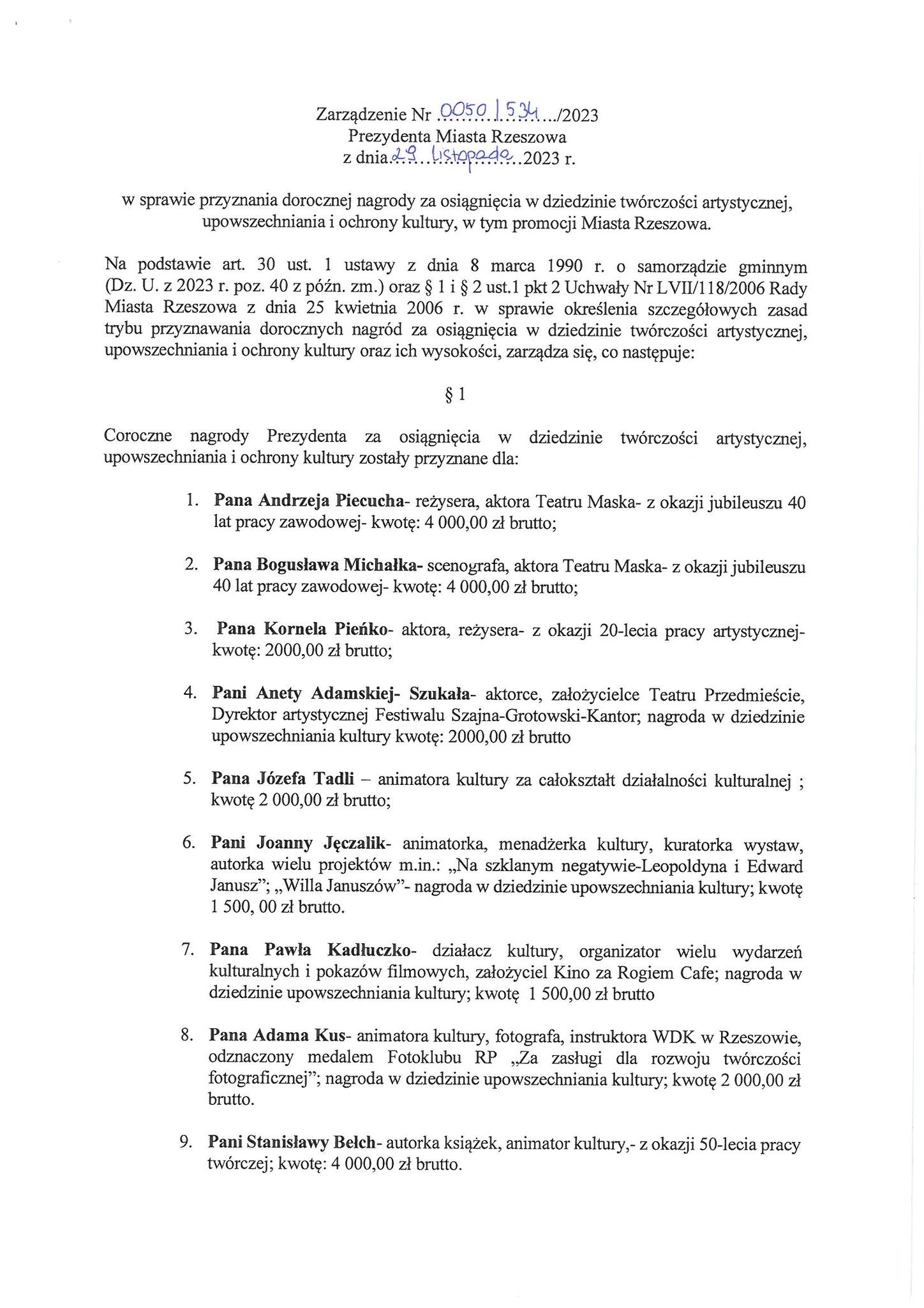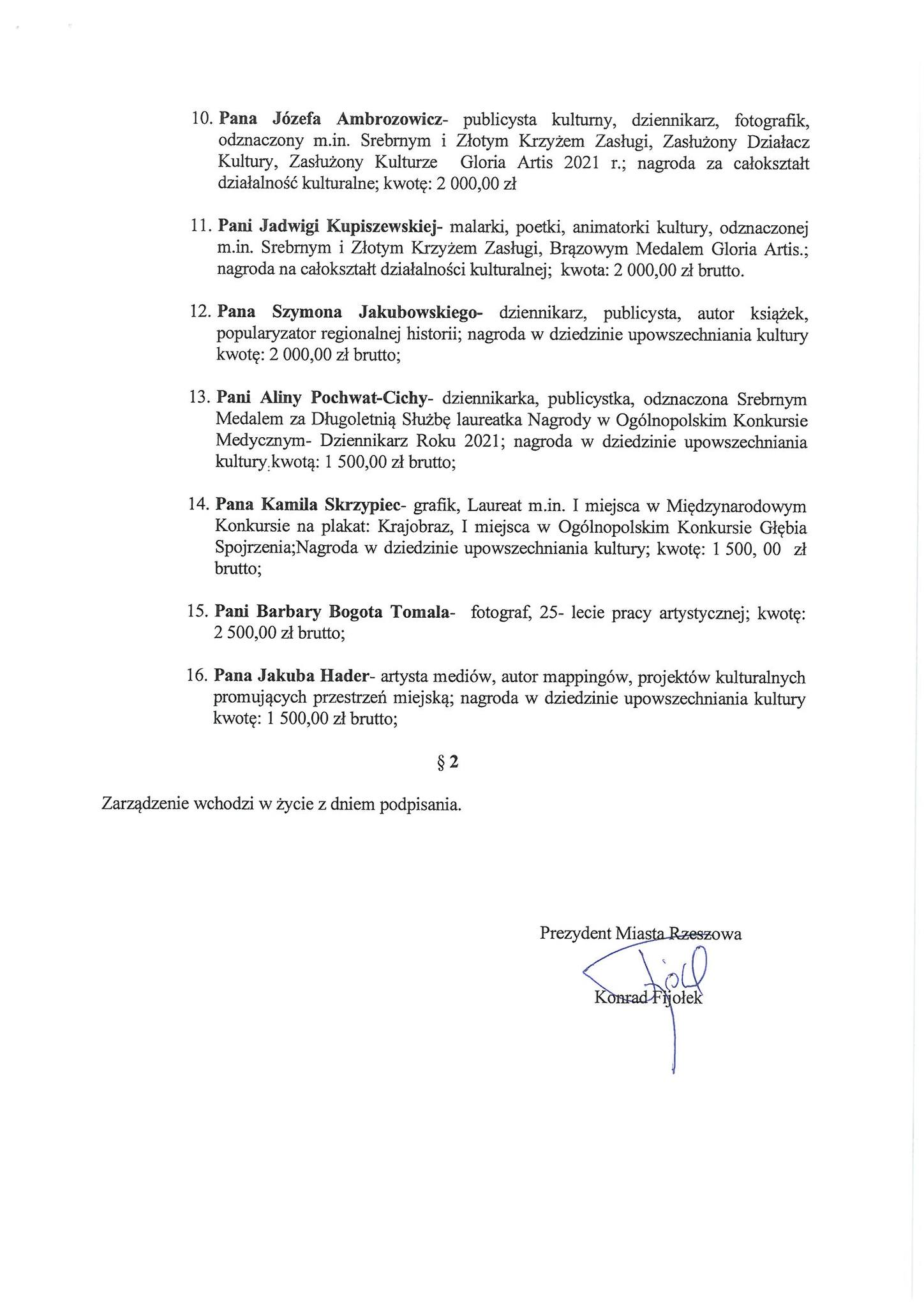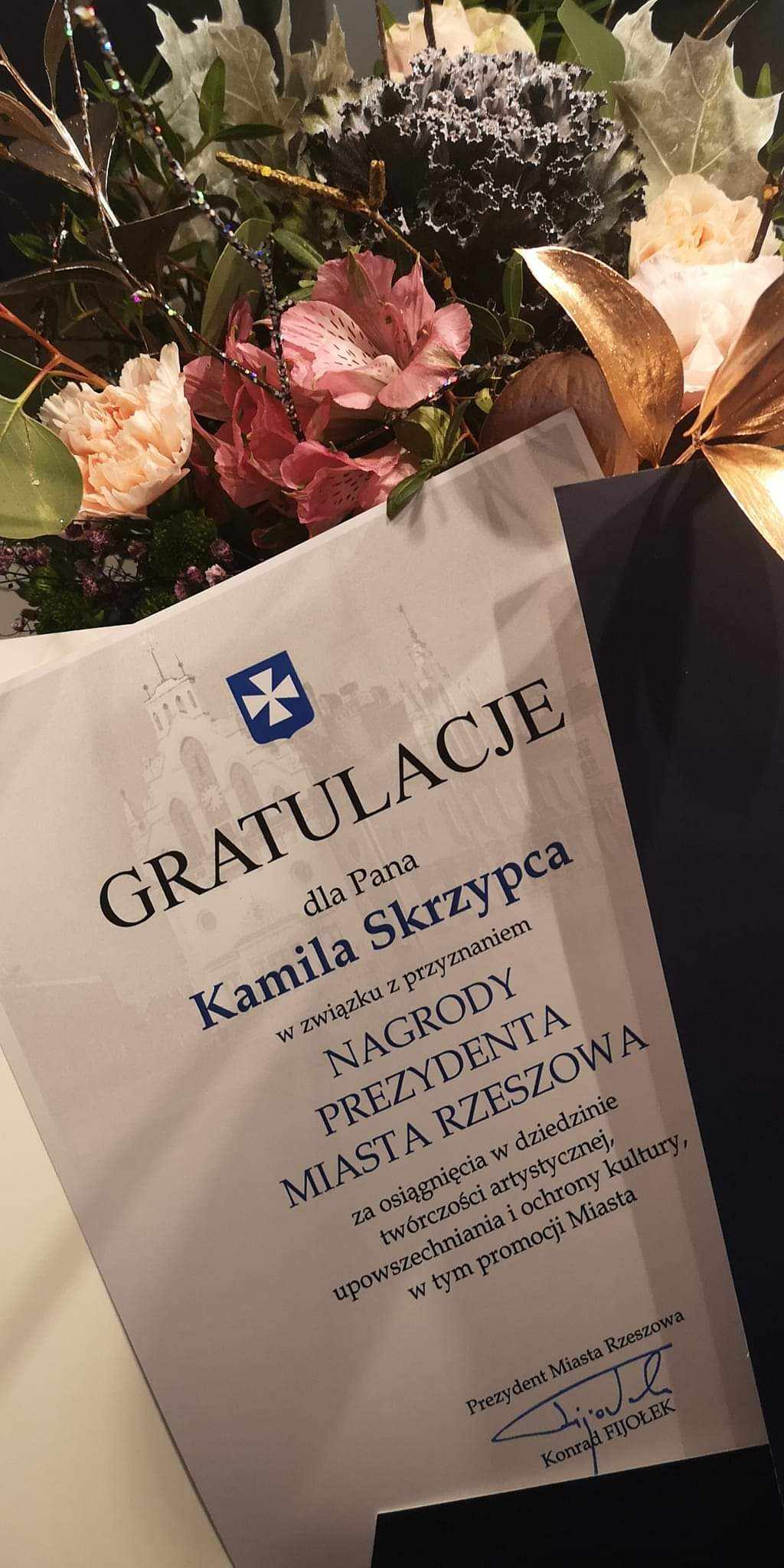 Kamil Skrzypiec - laureat nagrody Prezydenta Miasta Rzeszowa za osiągnięcia w dziedzinie twórczości artystycznej, upowszechniania i ochrony kultury, w tym promocji Miasta