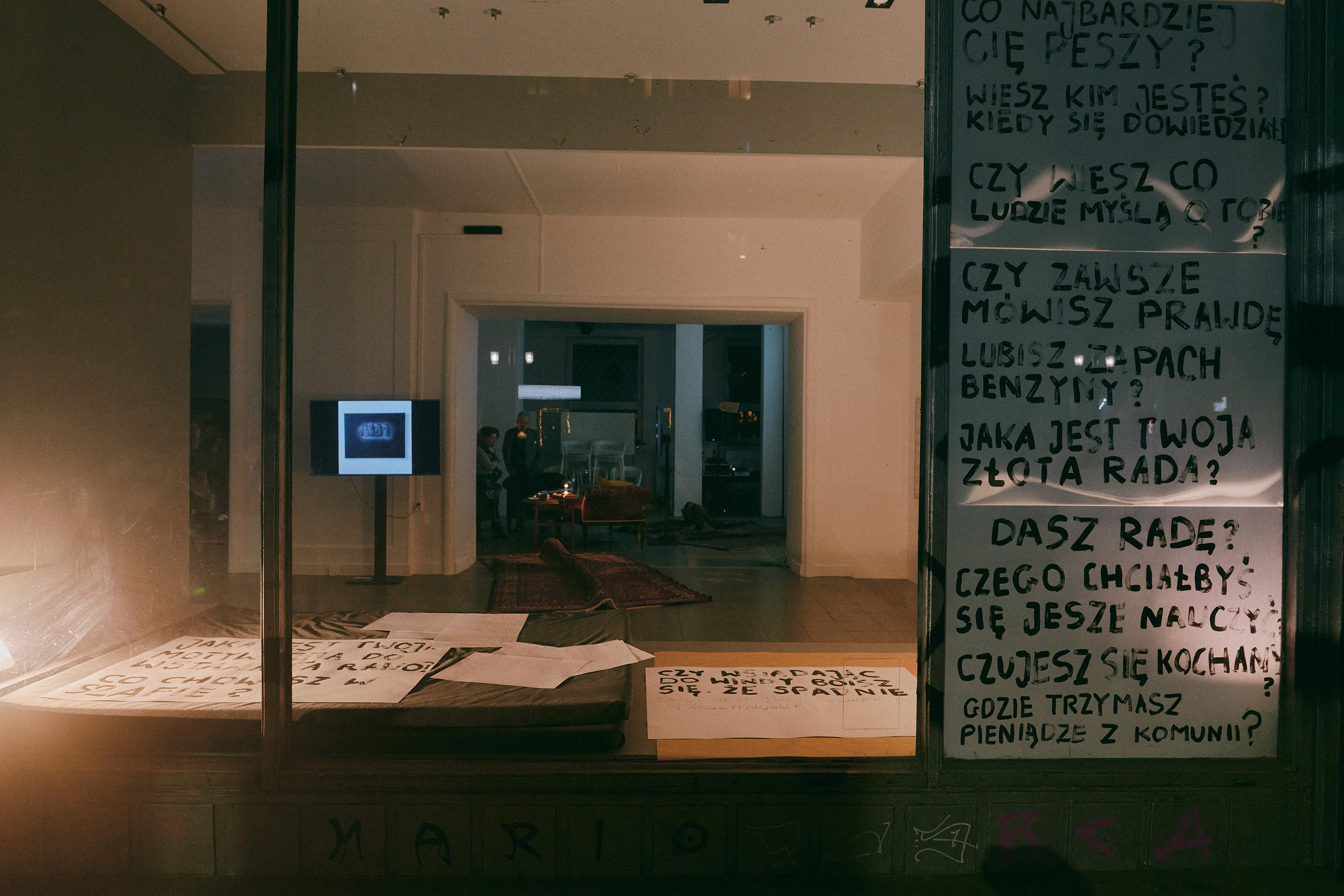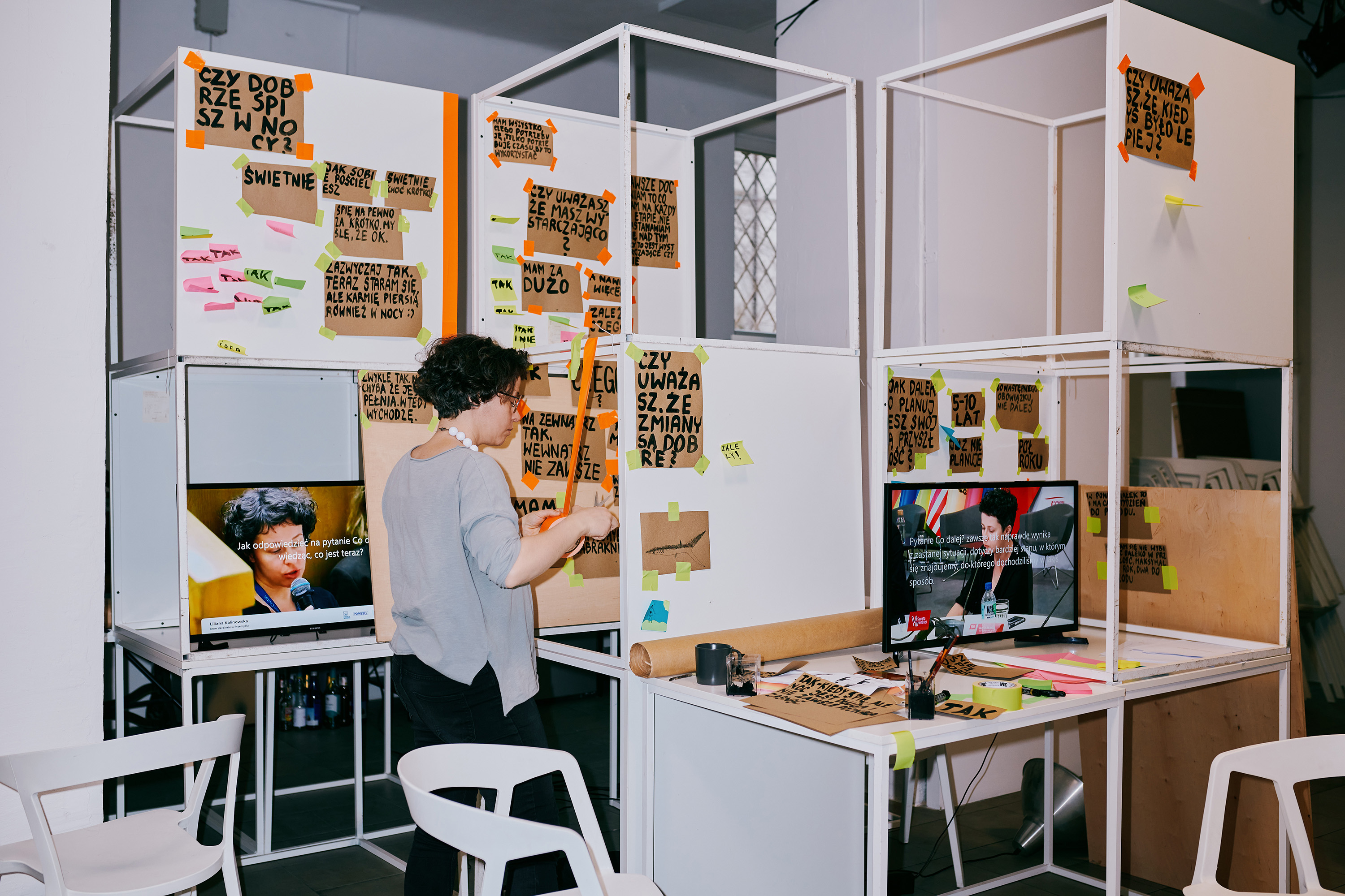 Założeniem rezydencji była wystawa w procesie- odpowiedzi były tworzone na bieżąco, a dodatkowym -dynamicznym elementem ekspozycji była obecność zwiedzających.