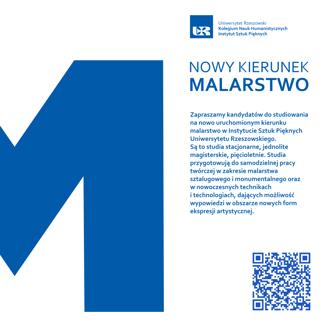 Zapraszamy kandydatów do studiowania na nowo uruchomionym kierunku malarstwo w Instytucie Sztuk Pięknych Uniwersytetu Rzeszowskiego. Są to studia stacjonarne, jednolite magisterskie, pięcioletnie. Studia przygotowują do samodzielnej pracy twórczej w zakresie malarstwa sztalugowego i monumentalnego oraz w nowoczesnych technikach i technologiach, dających możliwości wypowiedzi w obszarach nowych form ekspresji artystycznej.