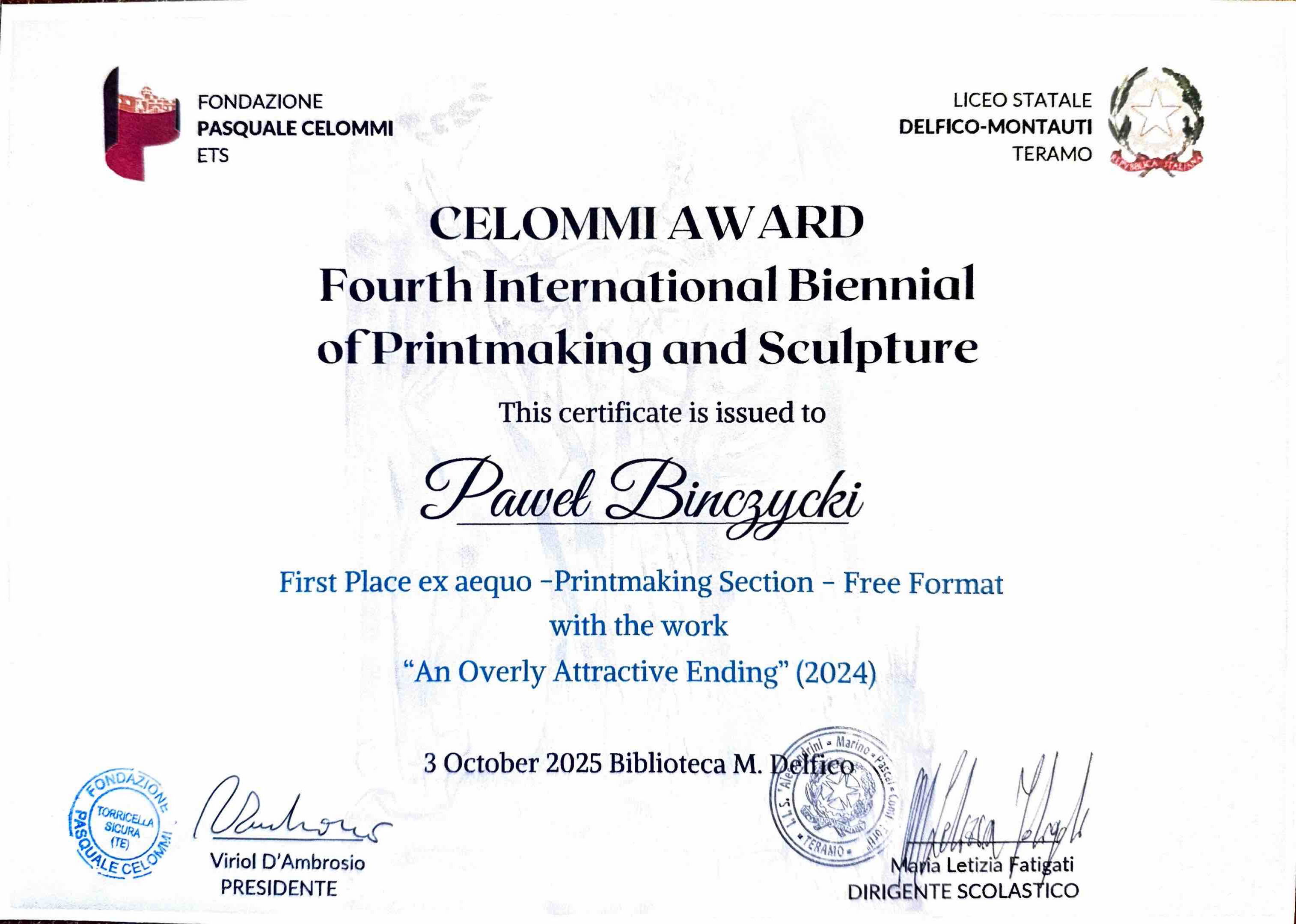 Fourth International Biennial of Engraving and Sculpture Premio Celommi 2025 organizowane przez Fondazione Pasquale Celommi i I.I.S. Delfico-Montauti, z każdą edycją zyskuje na popularności. W 2025 roku 100 artystów z wielu krajów (Argentyna, Austria, Włochy, Francja, Grecja, Honkong, Macedonia, Meksyk, Czarnogóra, Izrael, Turcja, Ukraina i Polska) zgłosiło na konkurs ponad 500 grafik i rzeźb.