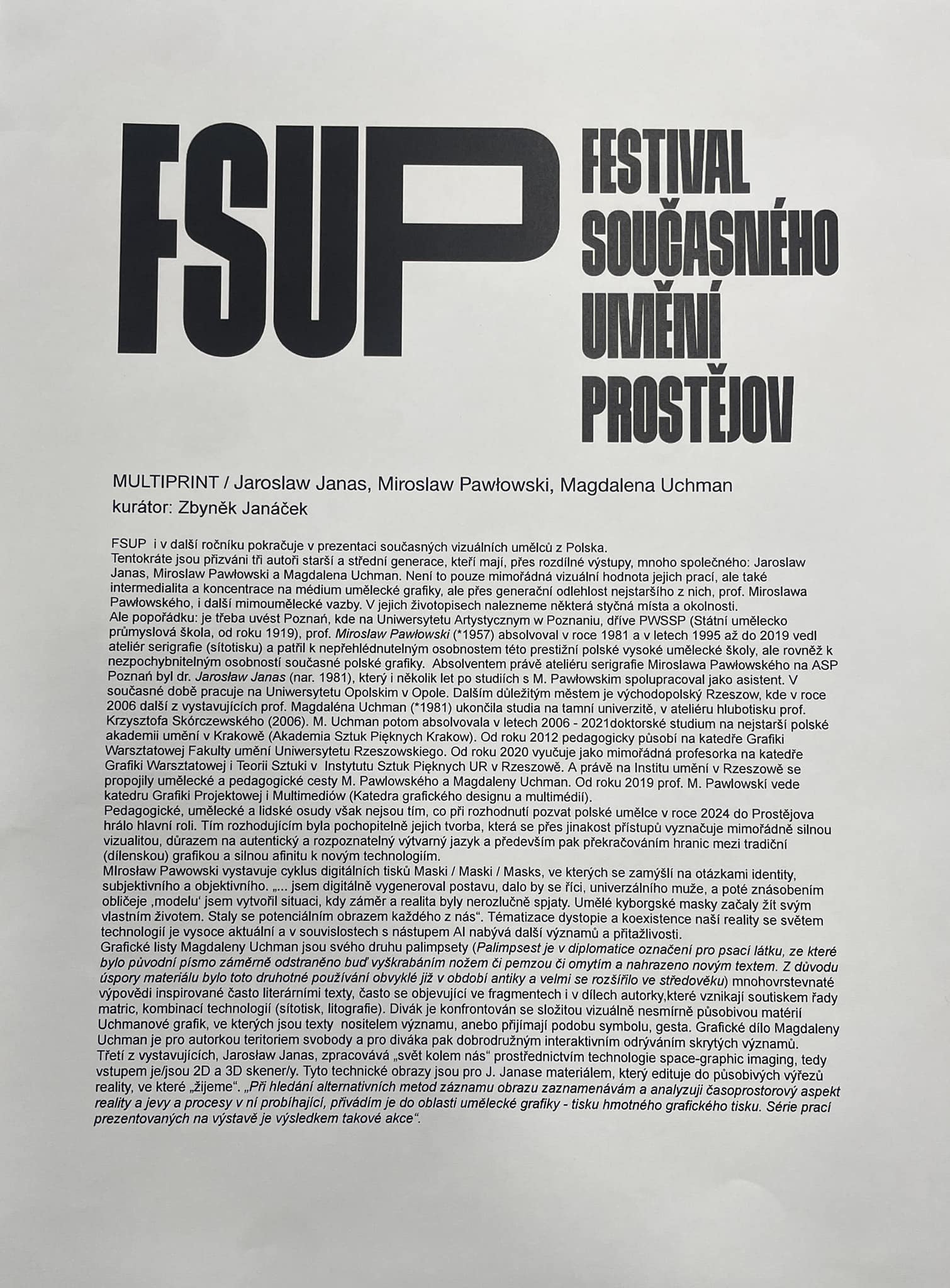 W dniach 3 – 5 października 2024 zapraszamy na Festiwal sztuki współczesnej do Prostĕjova (CZ) , oraz wystawę pt. „Multipint”: Janas, Uchman, Pawłowski