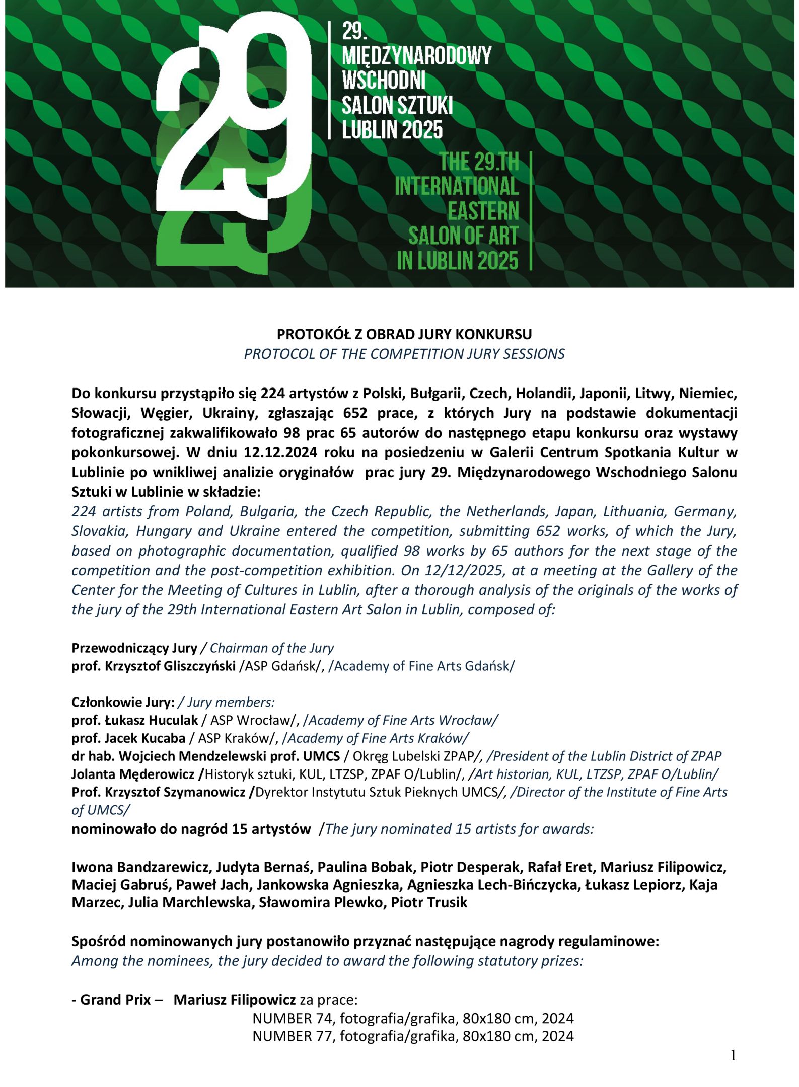 W dniu 12.12.2024 roku na posiedzeniu w Galerii Centrum Spotkania Kultur w Lublinie po analizie oryginałów prac jury 29. Międzynarodowego Wschodniego Salonu Sztuki w Lublinie w składzie: