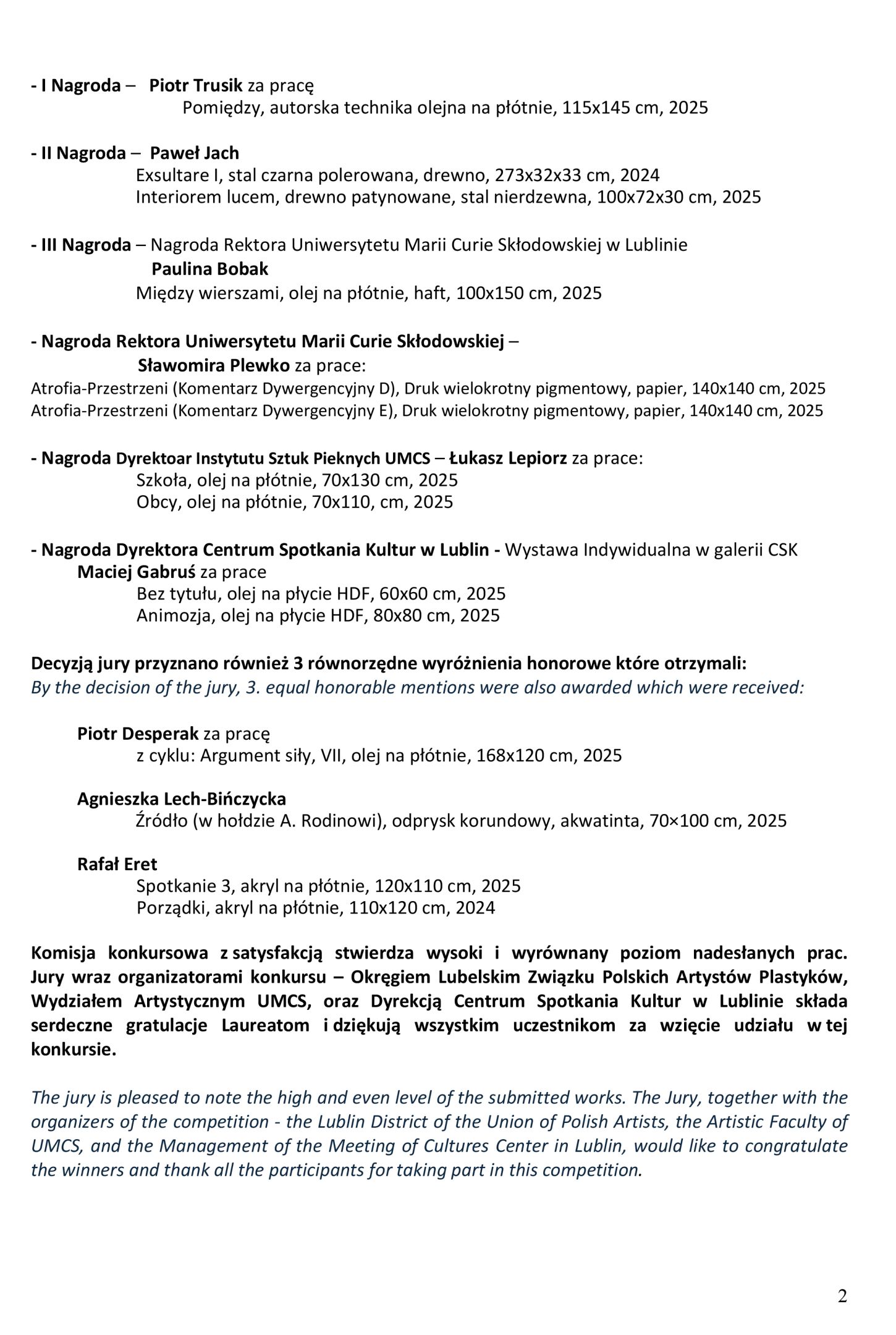 Członkowie Jury: prof. Łukasz Huculak (ASP Wrocław); prof. Jacek Kucaba (ASP Kraków); dr hab. Wojciech Mendzelewski prof. UMCS (Okręg Lubelski ZPAP); Jolanta Męderowicz, historyk sztuki (KUL, LTZSP, ZPAF O Lublin); Prof. Krzysztof Szymanowicz (Dyrektor Instytutu Sztuk Pieknych UMCS) nominowało do nagród 15 artystów.