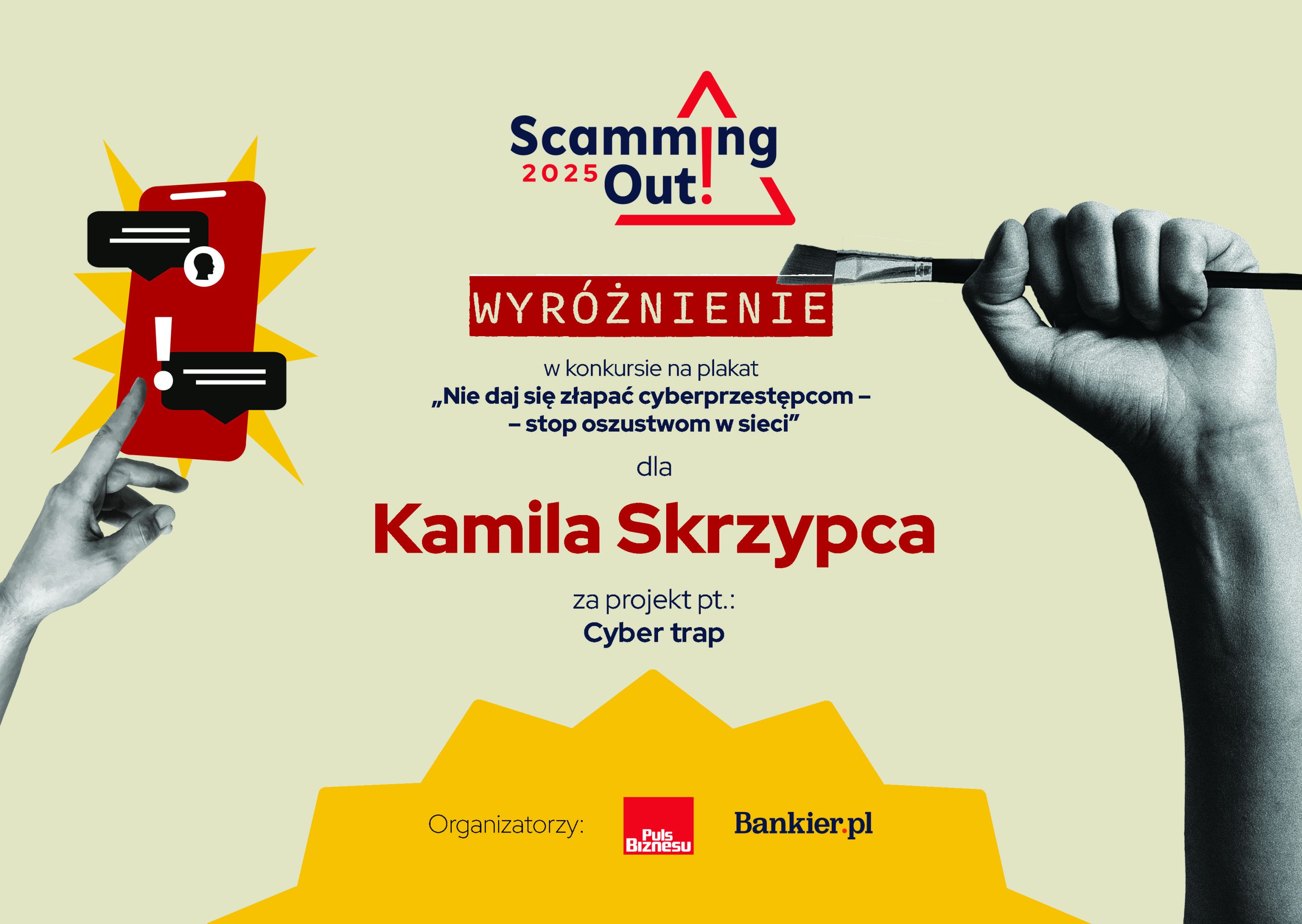 Kamil Skrzypiec, pracownik Wydziału Sztuk Pięknych Uniwersytetu Rzeszowskiego, otrzymał wyróżnienie w ogólnopolskim konkursie na plakat SCAMMING OUT – Stop oszustom w sieci organizowanego przez Puls Biznesu i Bankier.pl, a patronami honorowymi było między innymi Stworzayszenie Twórców Grafiki Użytkowej, Ministerstwo Cyfryzacji i Ministerstwo Finansów.