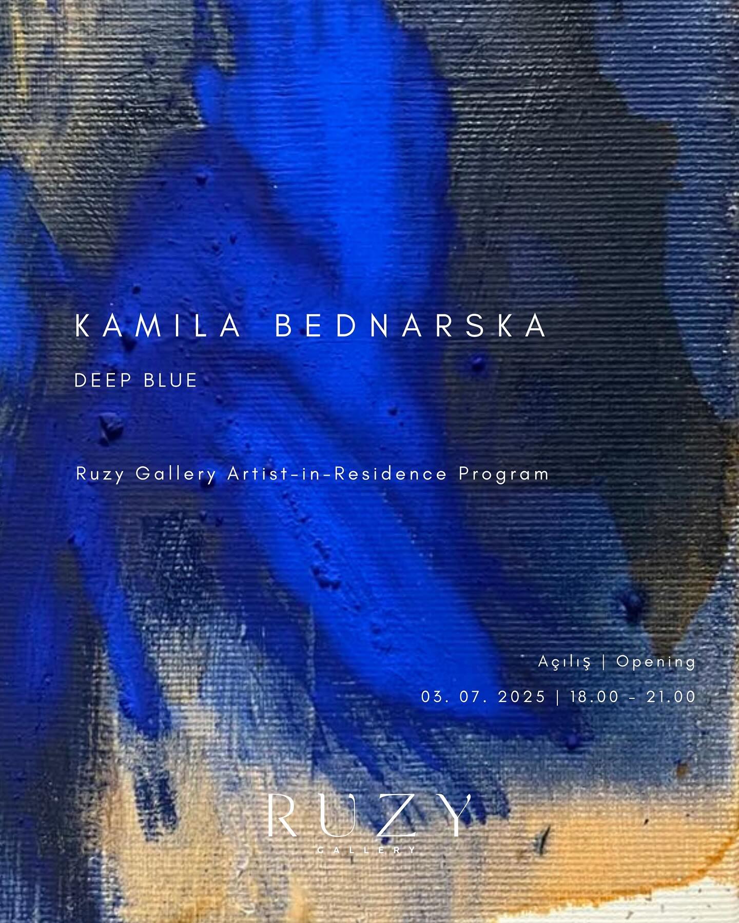 Wystawa “Deep Blue” dr Kamili Bednarskiej odbędzie się w ramach rezydencji artystycznej w Ruzy Gallery w Stambule w Turcji. Projekt bada koncepcję ruchu w jego wymiarze fizycznym, emocjonalnym, duchowym i egzystencjalnym. Prezentowane prace Kamili Bednarskiej w dziedzinie malarstwa, grafiki i tekstyliów krążą także wokół znaczenia koloru niebieskiego.