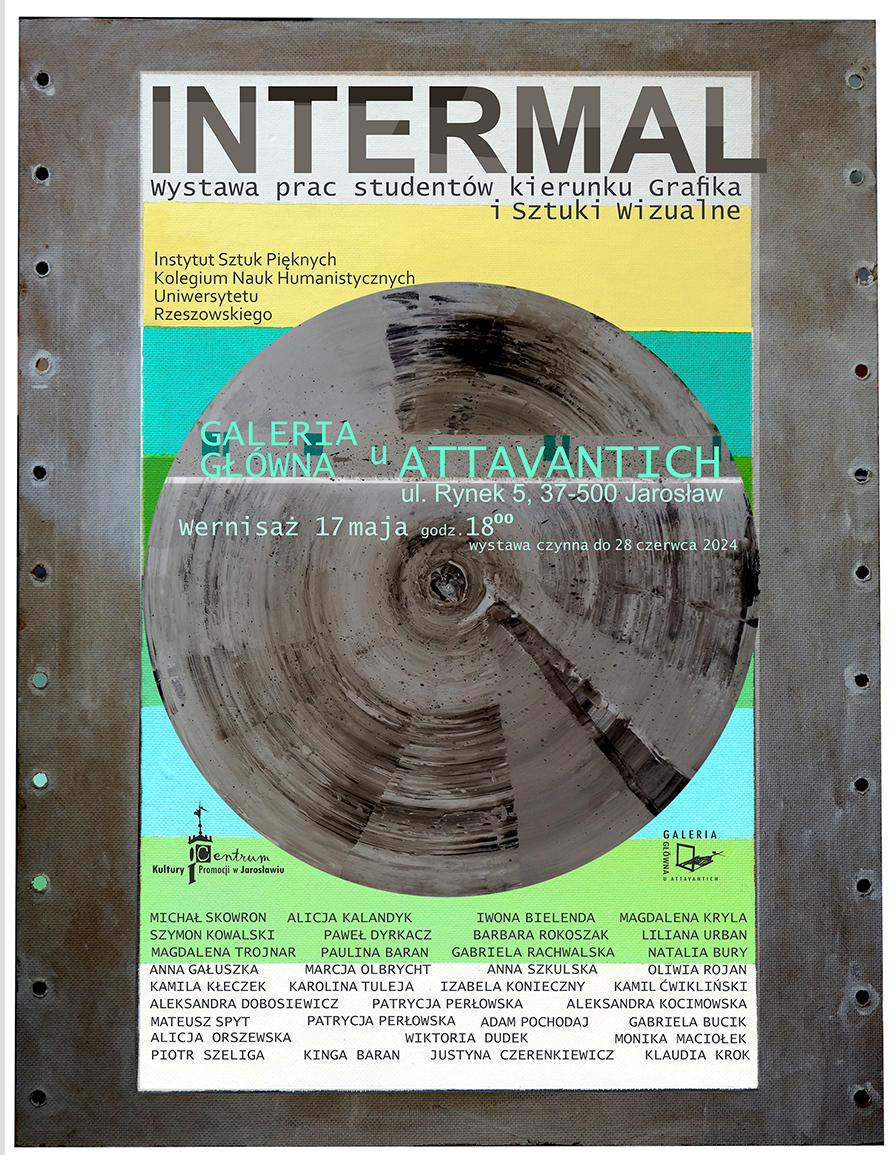 W dniu 17 maja 2024, o godz. 18.00 zapraszamy do Galerii Głównej u Attavantich w Jarosławiu na otwarcie interdyscyplinarnej wystawy pt. INTERMAL, gdzie zostaną zaprezentowane prace studentów kierunku Grafika i Sztuki Wizualne, prowadzonych przez dr. hab. Jarosława Sankowskiego, prof. UR.