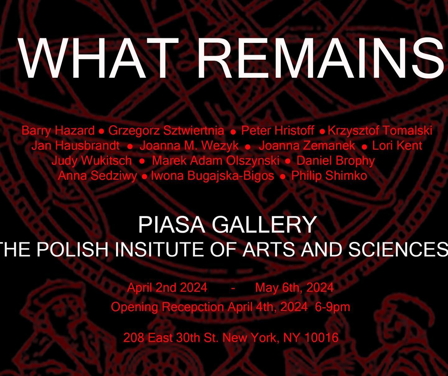 Zapraszamy na otwarcie wystawy zbiorowej pt. „WHAT REMAINS” w Piasa Gallery, w Polskim Instytucie Sztuki i Nauki na Manhattanie w Nowym Jorku. W wystawie udział bierze dr hab. Marek Adam Olszyński, prof. UR.