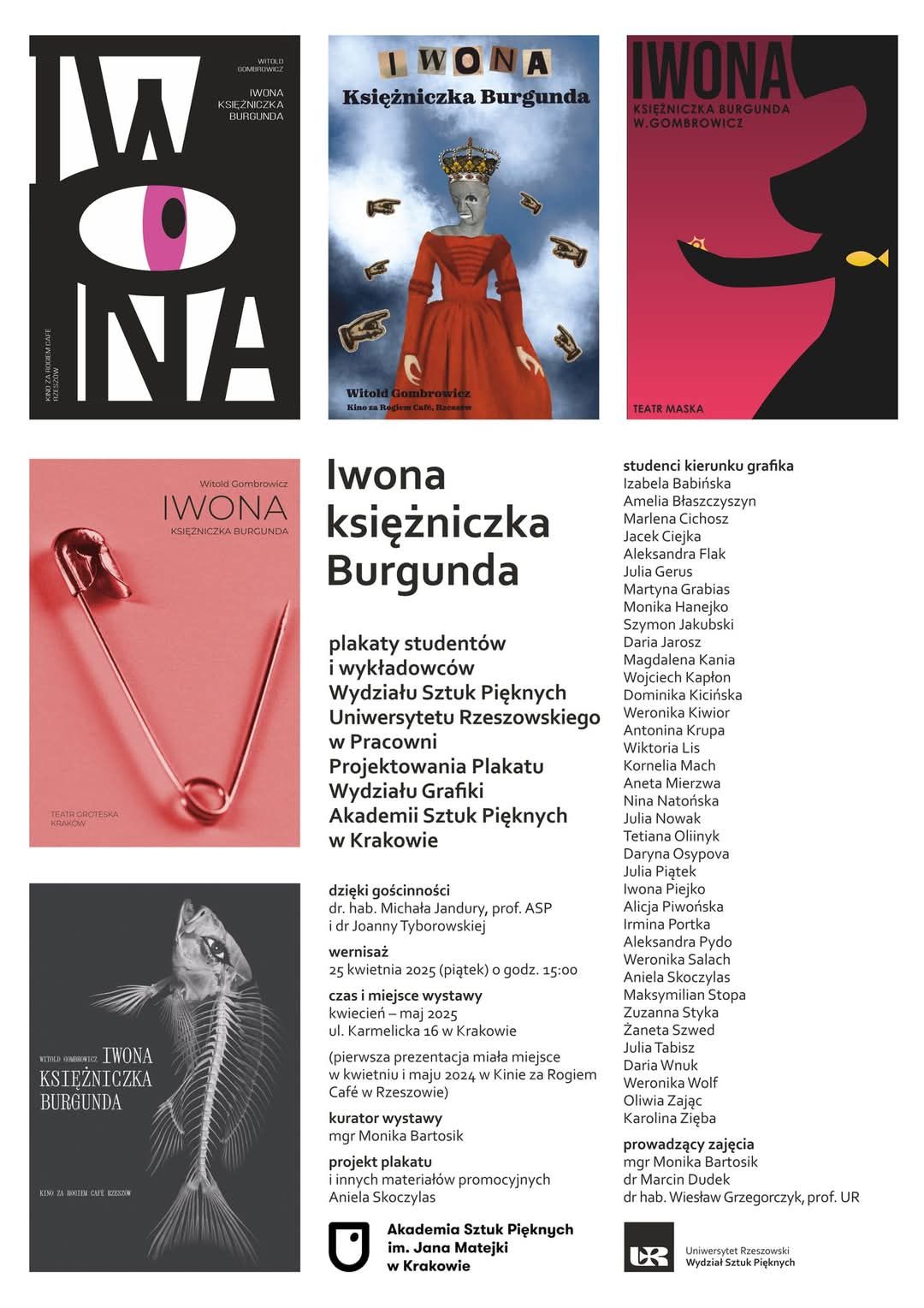 Zapraszamy na wystawę plakatów do „Iwony księżniczki Burgunda” Witolda Gombrowicza, autorstwa studentów i pedagogów Wydziału Sztuk Pięknych Uniwersytetu Rzeszowskiego. Na ekspozycji łącznie zaprezentowanych zostało ponad 40 plakatów zrealizowanych w ramach roku Gombrowicza w 2024.