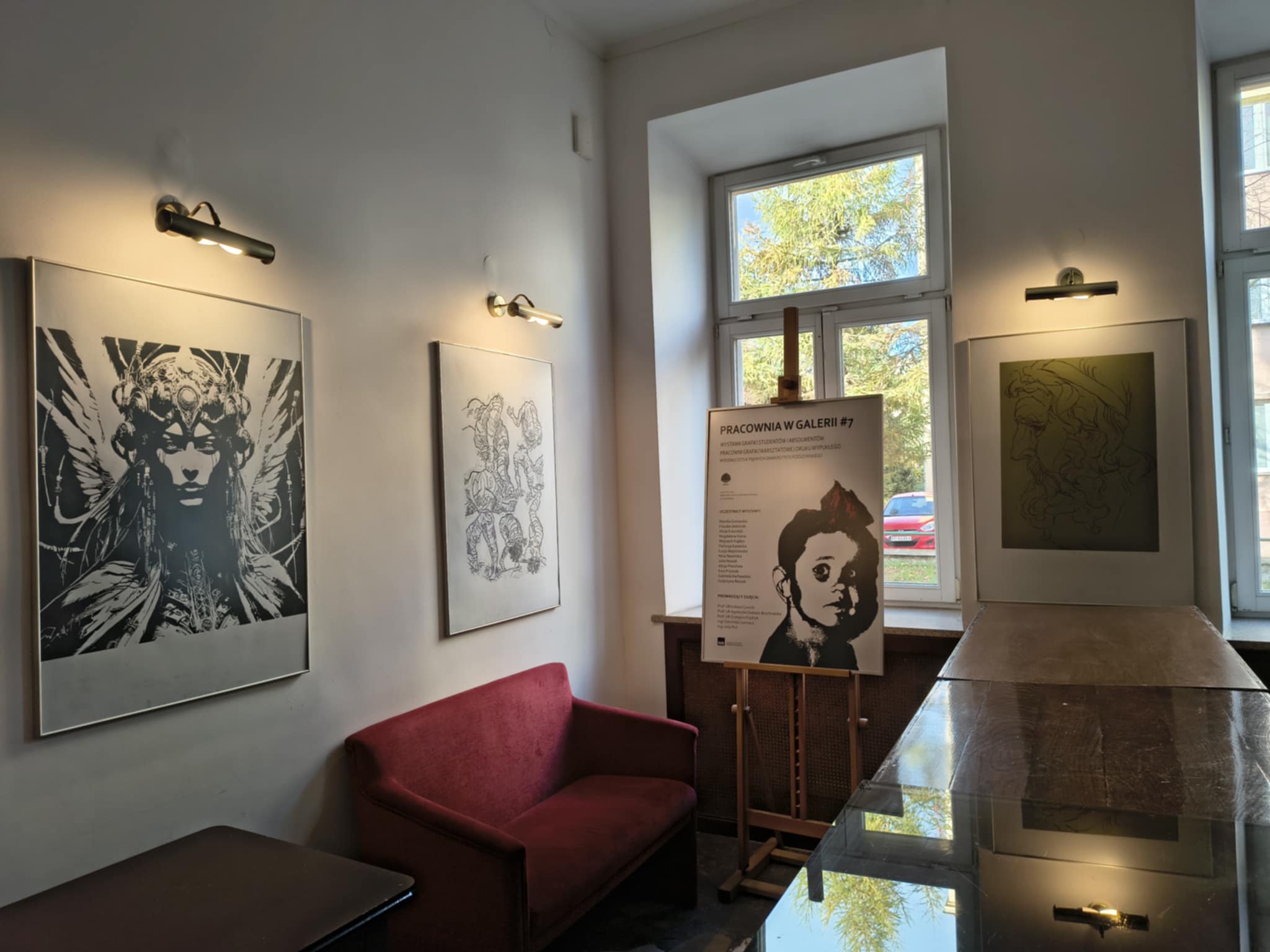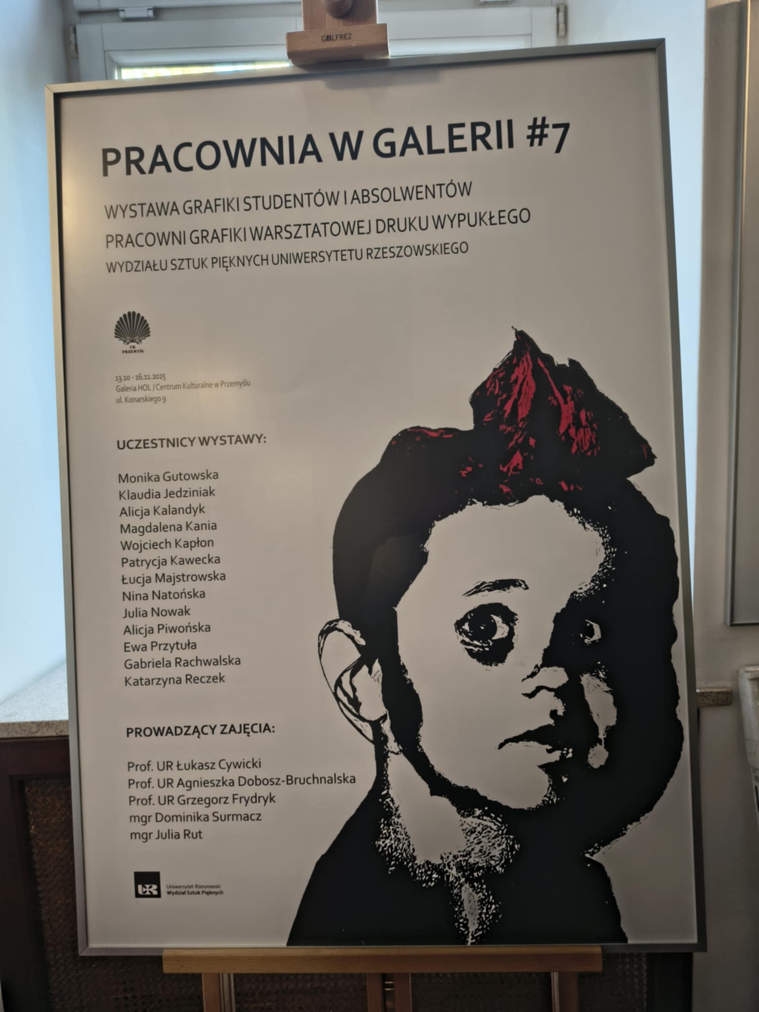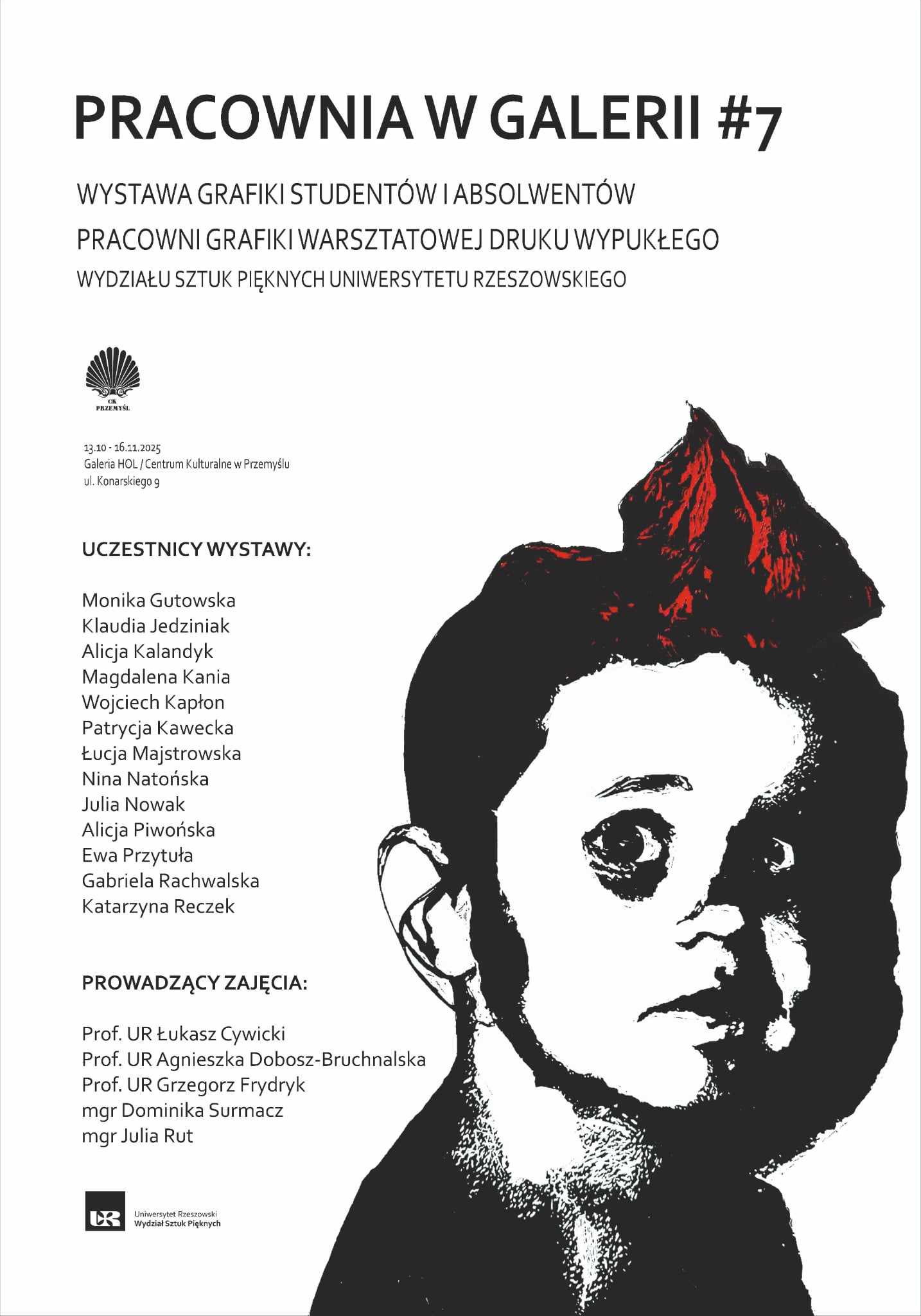 „Pracownia w Galerii #7” to kolejna odsłona cyklicznej wystawy prezentującej dorobek studentów i absolwentów Pracowni Grafiki Warsztatowej Druku Wypukłego Wydziału Sztuk Pięknych Uniwersytetu Rzeszowskiego. Wydarzenie ukazuje potencjał twórczy młodego pokolenia artystów, którzy posługując się klasycznymi technikami graficznymi, podejmują aktualne tematy i eksperymentują z formą, fakturą oraz narracją wizualną. Ekspozycja jest przeglądem prac wykonanych głównie w technikach druku wypukłego - linorytu, łączących tradycję grafiki warsztatowej z nowoczesnym podejściem do obrazu. Obok prac o charakterze refleksyjnym i osobistym, pojawiają się także kompozycje nacechowane ironią, grą czy symboliką. Wystawa będzie dostępna dla zwiedzających w dniach 13 października – 16 listopada 2025 roku w Galerii HOL, mieszczącej się w Centrum Kulturalnym w Przemyślu. To miejsce od lat wspiera inicjatywy artystyczne i edukacyjne, promując twórczość zarówno lokalnych, jak i ogólnopolskich środowisk twórczych. W projekcie bierze udział trzynastu studentów i absolwentów Uniwersytetu Rzeszowskiego. Ich prace powstały pod kierunkiem zespołu dydaktycznego w składzie: prof. UR Łukasz Cywicki, prof. UR Agnieszka Dobosz-Bruchnalska, prof. UR Grzegorz Frydryk, mgr Dominika Surmacz oraz mgr Julia Rut. „Pracownia w Galerii #7” to nie tylko prezentacja osiągnięć edukacyjnych i artystycznych, ale także zaproszenie do dialogu o współczesnej grafice warsztatowej i roli sztuki w kształtowaniu indywidualnych postaw twórczych.