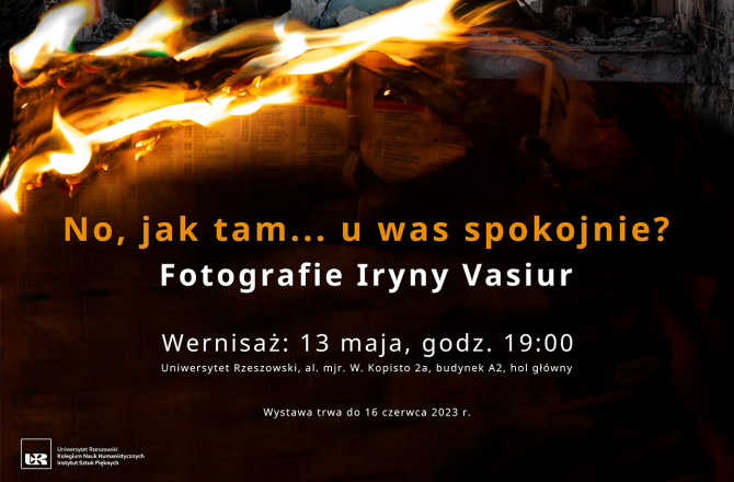 Zapraszanie na wernisaż "No, jak tam... u was spokojnie ?"- fotografie Iryny Vasiur w ramach Dni Muzeów w Instytucie Sztuk Pięknych, 13 maja 2023 r. o godz.: 19:00 w holu głównym budynku Uniwersytetu Rzeszowskiego, al. mjr. W. Kopisto 2a, budynek A2.