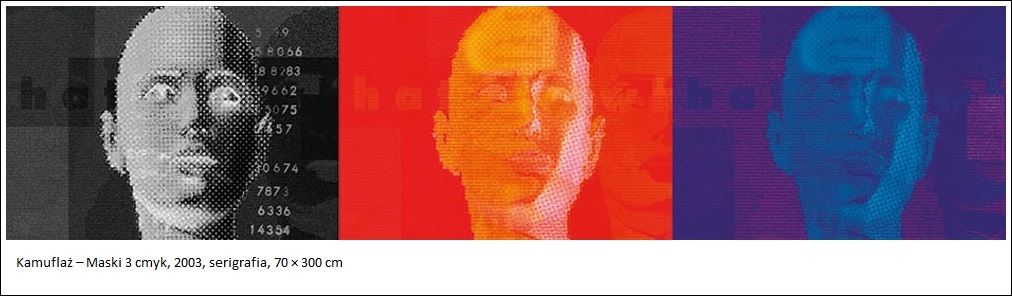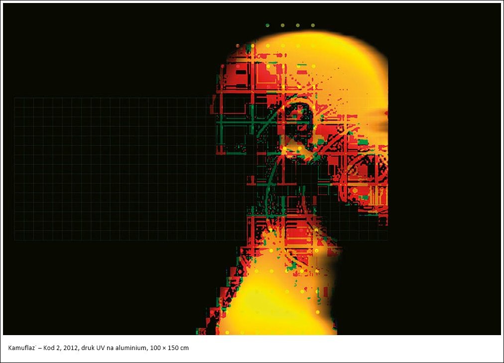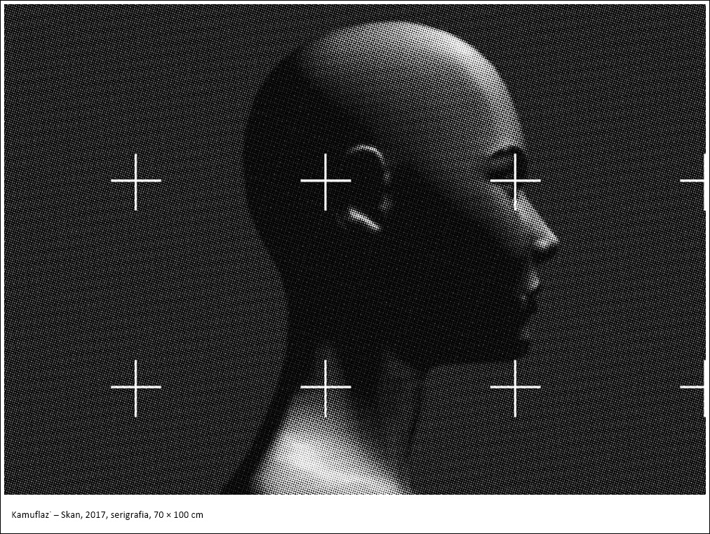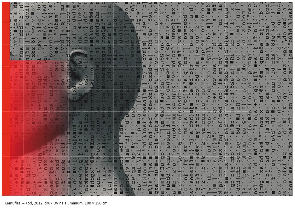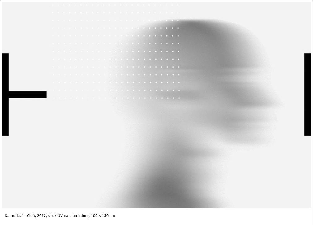Cykl “Kamuflaż” oscyluje wokół zagadnienia człowieka „portretowanego” według niejednorodnego, zmieniającego się klucza konwencji. Często to właśnie sam proces zawiera w sobie paradoks wyrażony w przedstawieniu – prawdę ambiwalencji, relatywizowanej poprzez płynne definicje podmiotu i przedmiotu, z całym spectrum wynikających z tego faktu konsekwencji. Metaforyzuję fenomen percepcji, budując wokół „wizerunku” wielowarstwowe znaczenia, które za każdym razem stają się moim komentarzem współczesności. Grafiki realizuję w technice serigrafii i druku UV na płytach aluminiowych.