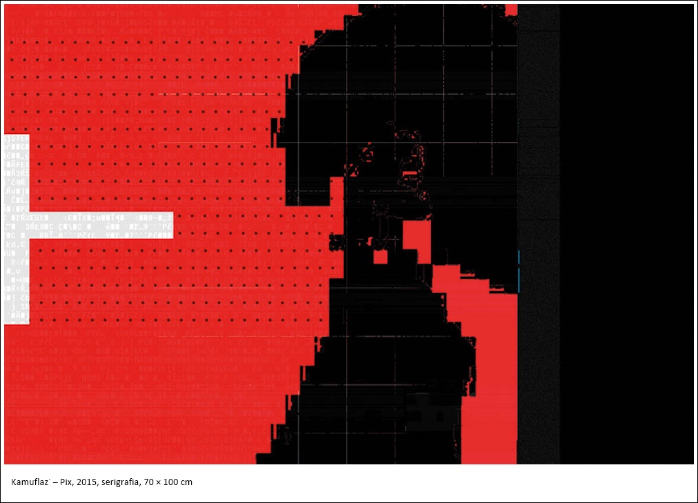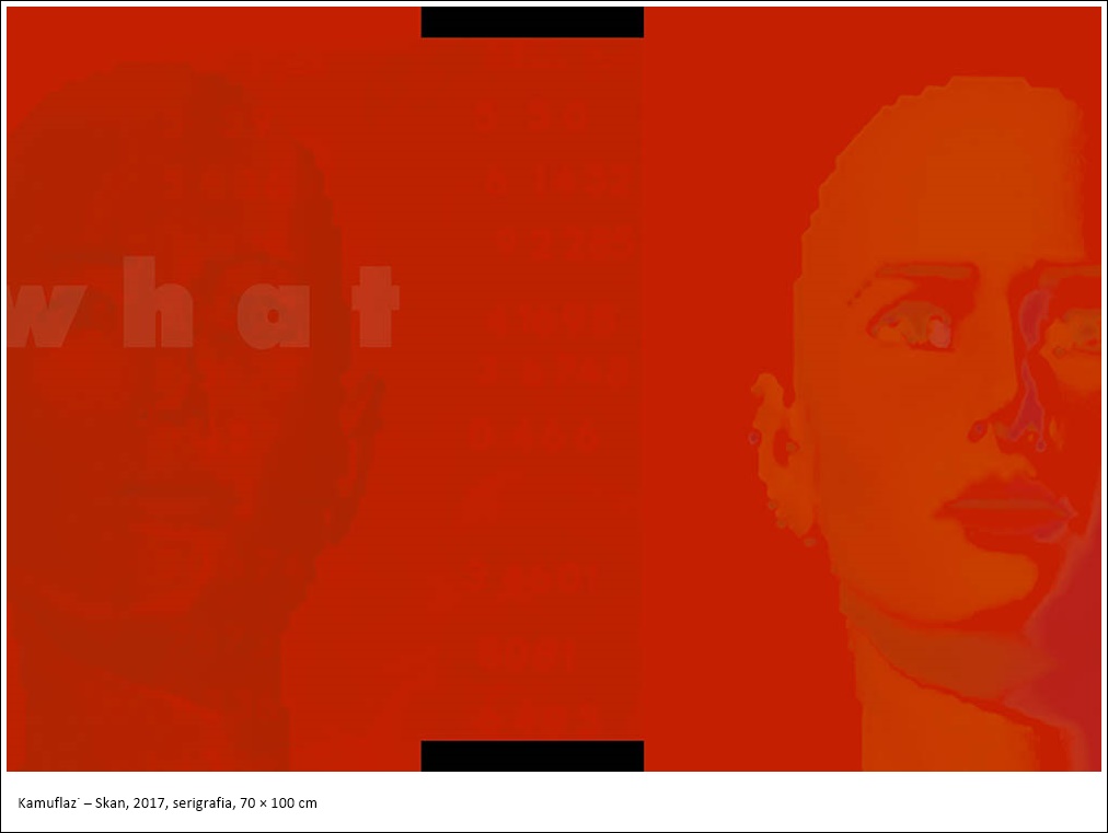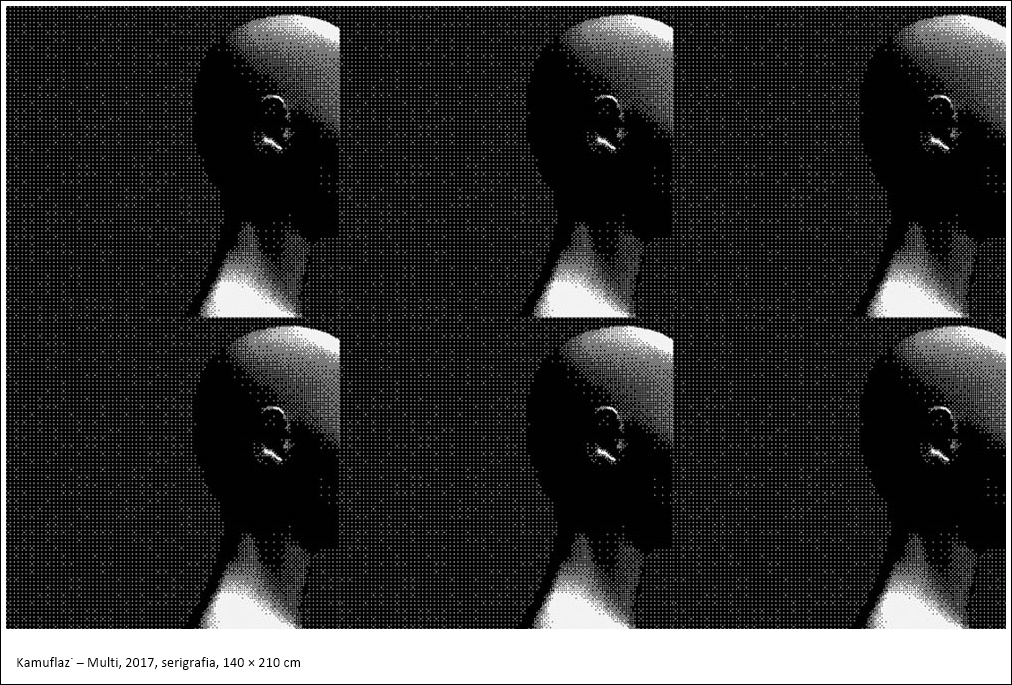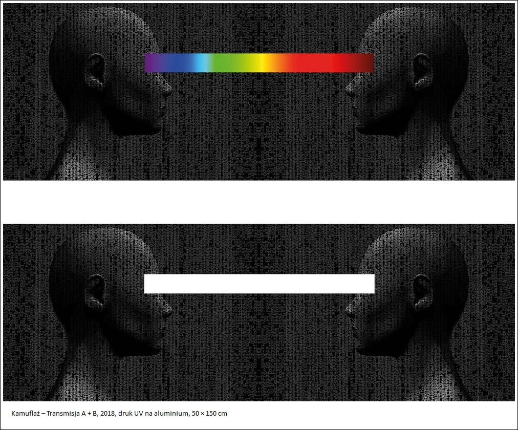 Cykl “Kamuflaż” oscyluje wokół zagadnienia człowieka „portretowanego” według niejednorodnego, zmieniającego się klucza konwencji. Często to właśnie sam proces zawiera w sobie paradoks wyrażony w przedstawieniu – prawdę ambiwalencji, relatywizowanej poprzez płynne definicje podmiotu i przedmiotu, z całym spectrum wynikających z tego faktu konsekwencji. Metaforyzuję fenomen percepcji, budując wokół „wizerunku” wielowarstwowe znaczenia, które za każdym razem stają się moim komentarzem współczesności. Grafiki realizuję w technice serigrafii i druku UV na płytach aluminiowych.