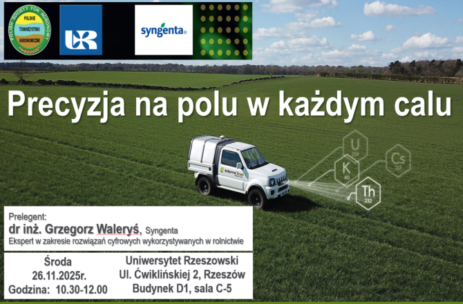 W dniu 26 listopada 2025 r. w Rzeszowie-Zalesiu odbył się wykład otwarty pt. "Precyzja na polu w każdym calu". Wykład wygłosił dr inż. Grzegorz Waleryś z firmy Syngenta.