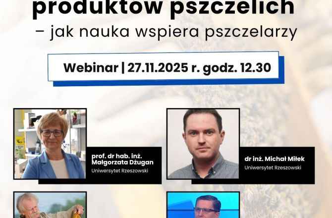 W dn. 27 grudnia pracownicy Katedry Chemii i Toksykologii Żywności prof. dr hab. inż. Małgorzata Dżugan i dr inż. Michał Miłek wzięli udział w webinarze on-line nt. Laboratoryjna ocena produktów pszczelich- jak nauka wspiera pszczelarzy, zorganizowanym przez Podkarpackie Centrum Innowacji.