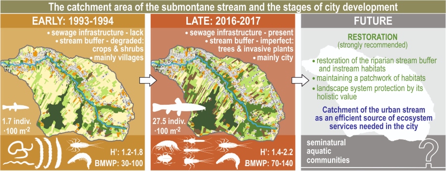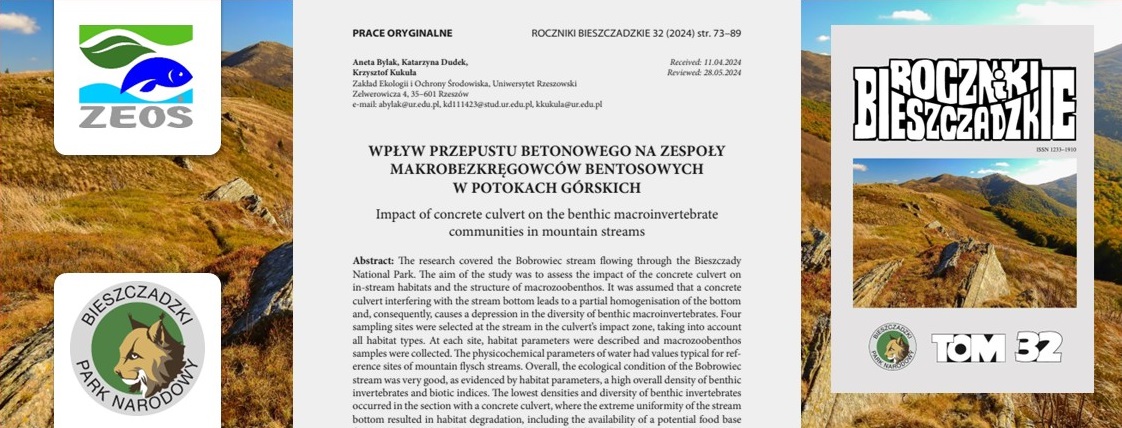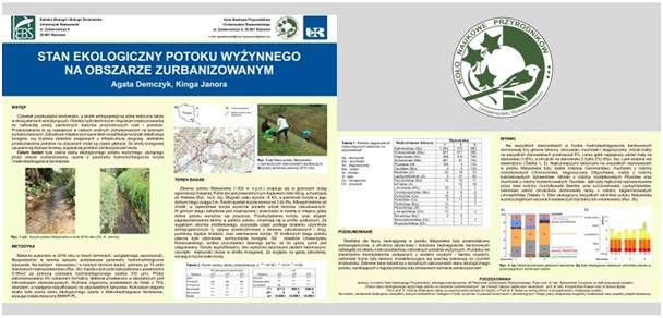 Projekt naukowy KNP UR „Ocena stanu ekologicznego wyżynnego potoku na obszarze zurbanizowanym”, w ubiegłym roku otrzymał dofinansowanie JM Rektora UR. Opiekunami naukowymi tego przedsięwzięcia są prof. dr hab. Krzysztof Kukuła oraz dr Aneta Bylak. W pracach laboratoryjnych studentów wspierała mgr Magdalena Wójcik. Kompleksowe badania terenowe rozpoczęły się początkiem marca 2016 roku, a zakończyły w czerwcu 2017 r. Zespołowa praca studentów pozwoliła na osiągnięcie wszystkich zaplanowanych celów naukowych projektu. Zebrano materiały dotyczące morfometrii koryta badanego potoku, parametrów fizyko-chemicznych wody i makrofauny bentosowej. Przeprowadzono także botaniczną analizy strefy ekotonowej oraz zidentyfikowano zagrożenia antropogeniczne. Dane są aktualnie na etapie analiz, ale już część z nich opracowano i przedstawiono na konferencji naukowej „Dekada różnorodności biologicznej”, która odbyła się 5 grudnia 2017 r. na Wydziale Biologiczno-Rolniczym. Poster „Stan ekologiczny potoku wyżynnego na obszarze zurbanizowanym” przygotowały mgr Agata Demczyk oraz Kinga Janora.