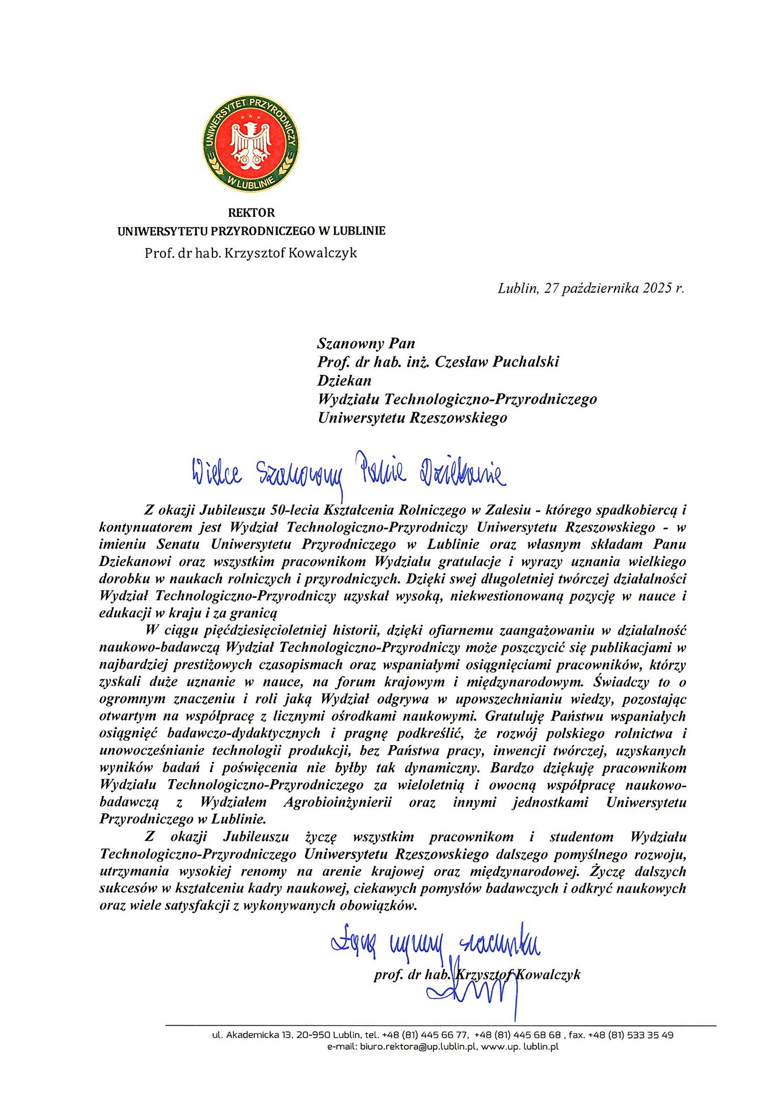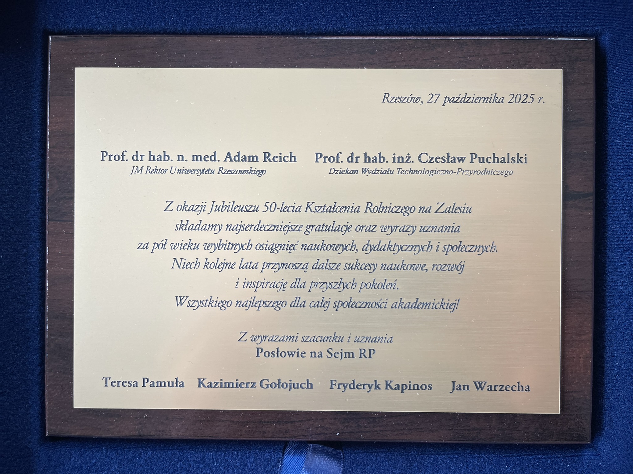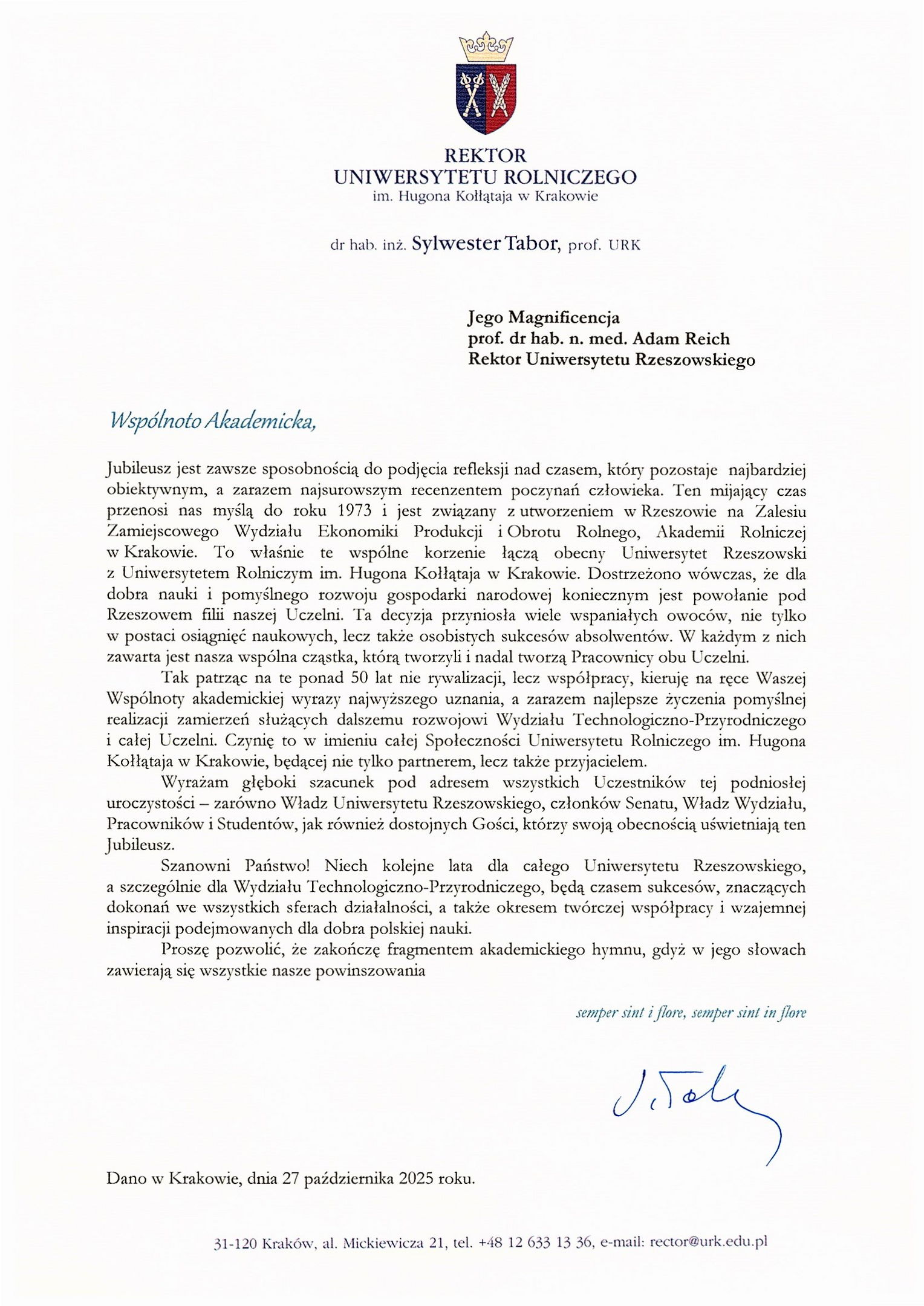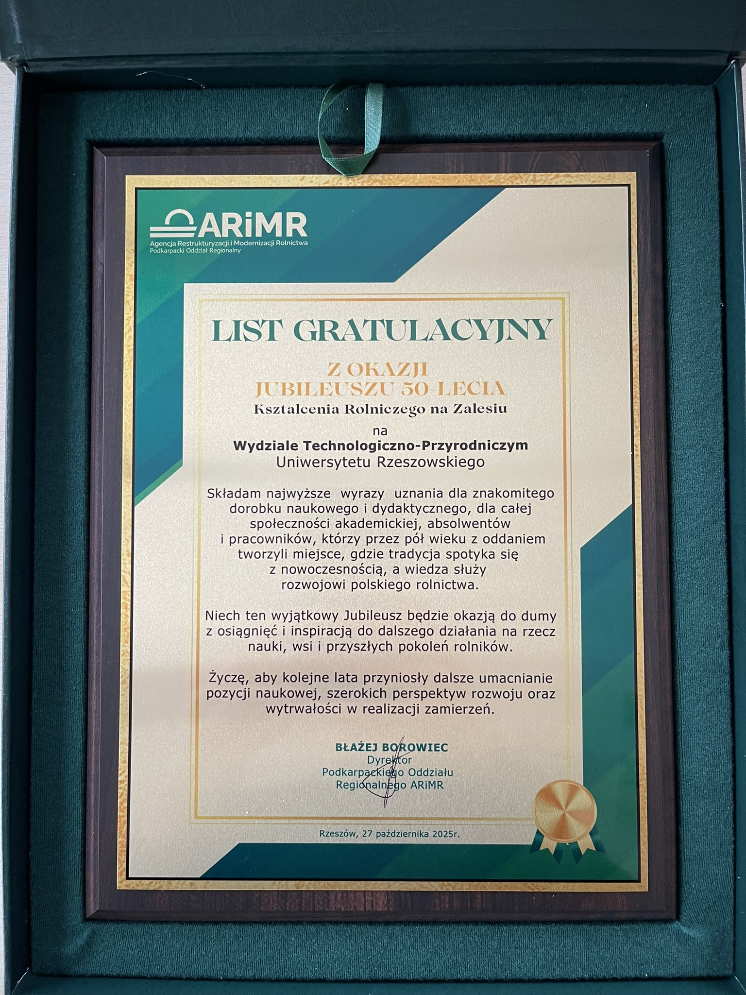27 października 2025 roku Wydział Technologiczno-Przyrodniczy Uniwersytetu Rzeszowskiego świętował wyjątkowy jubileusz – 50-lecie istnienia. Uroczystość była okazją do wspomnień, podsumowań i refleksji nad bogatą historią jednostki, która od pół wieku stanowi ważne centrum rozwoju nauk przyrodniczych i rolniczych na Podkarpaciu.