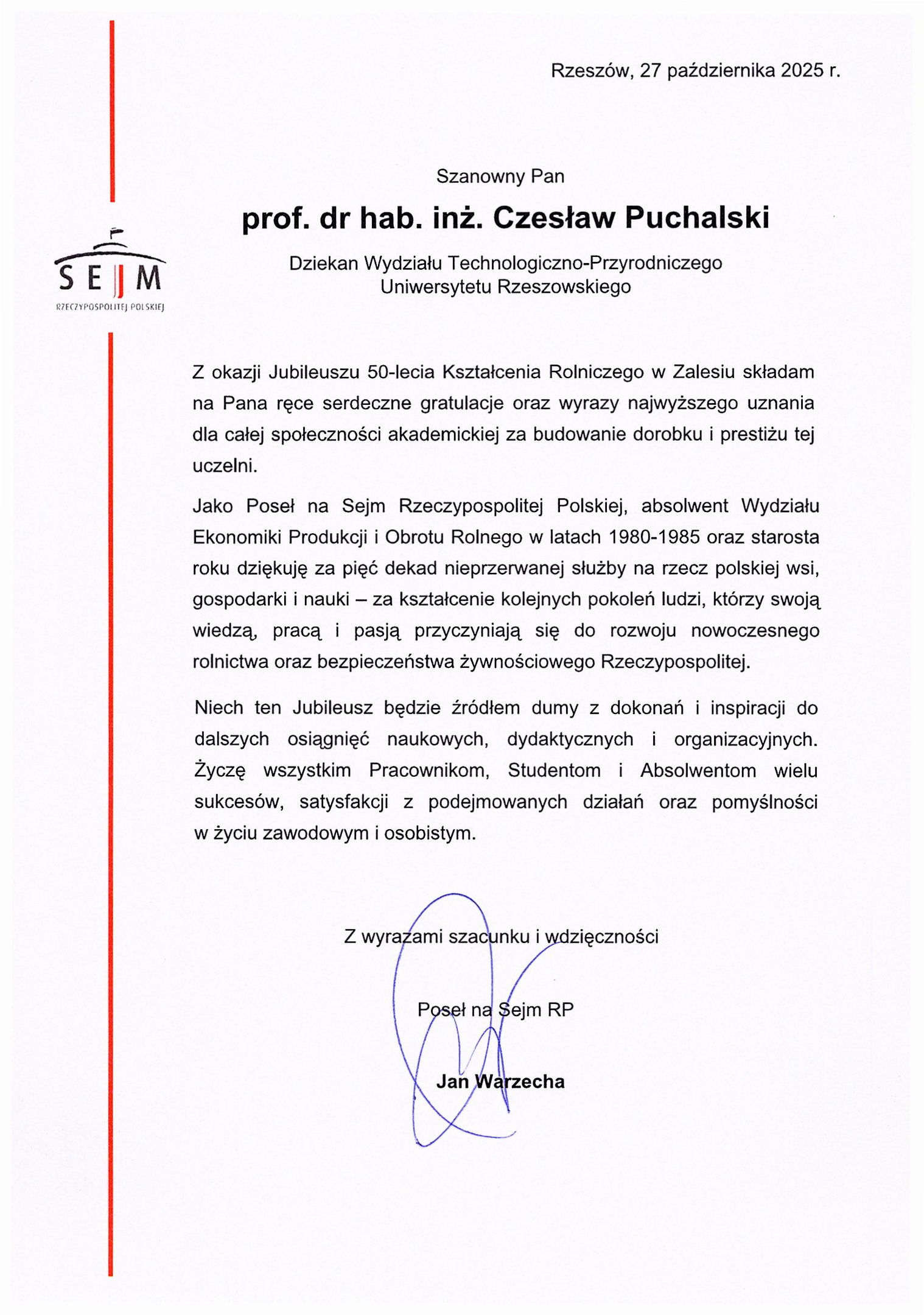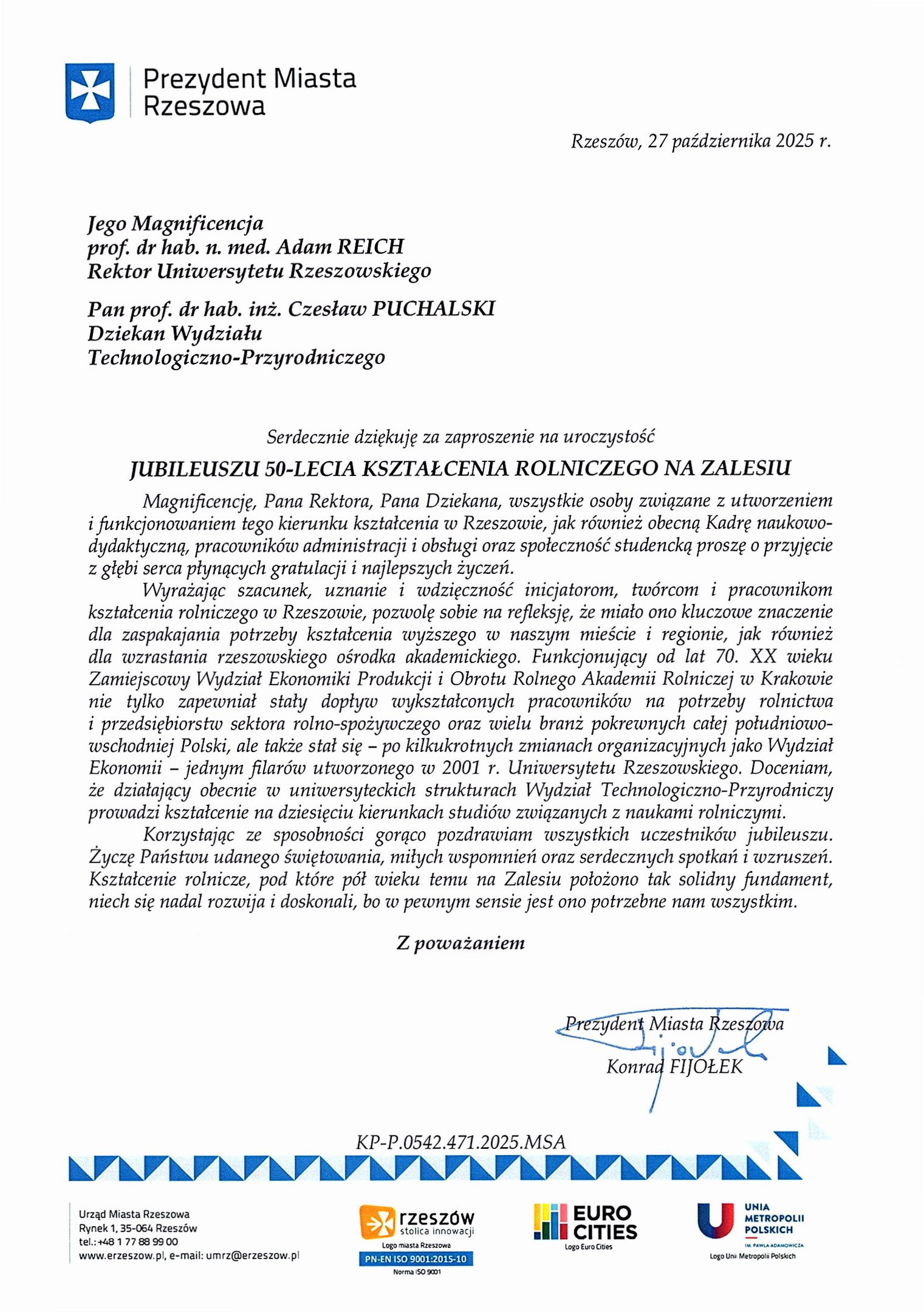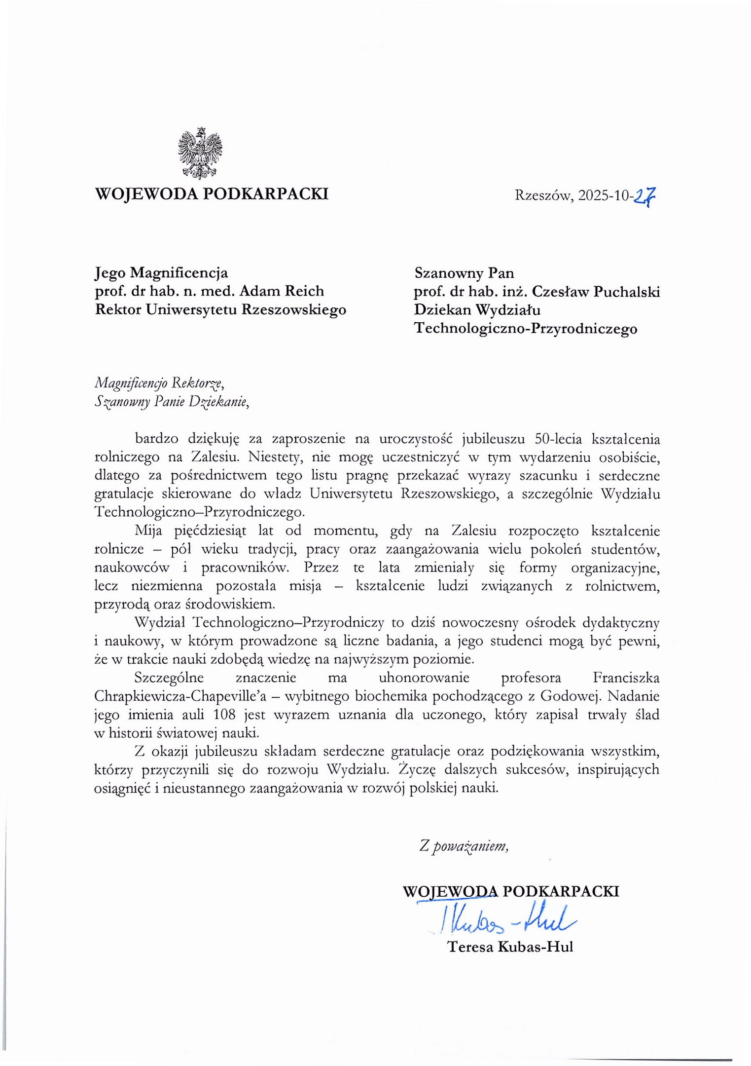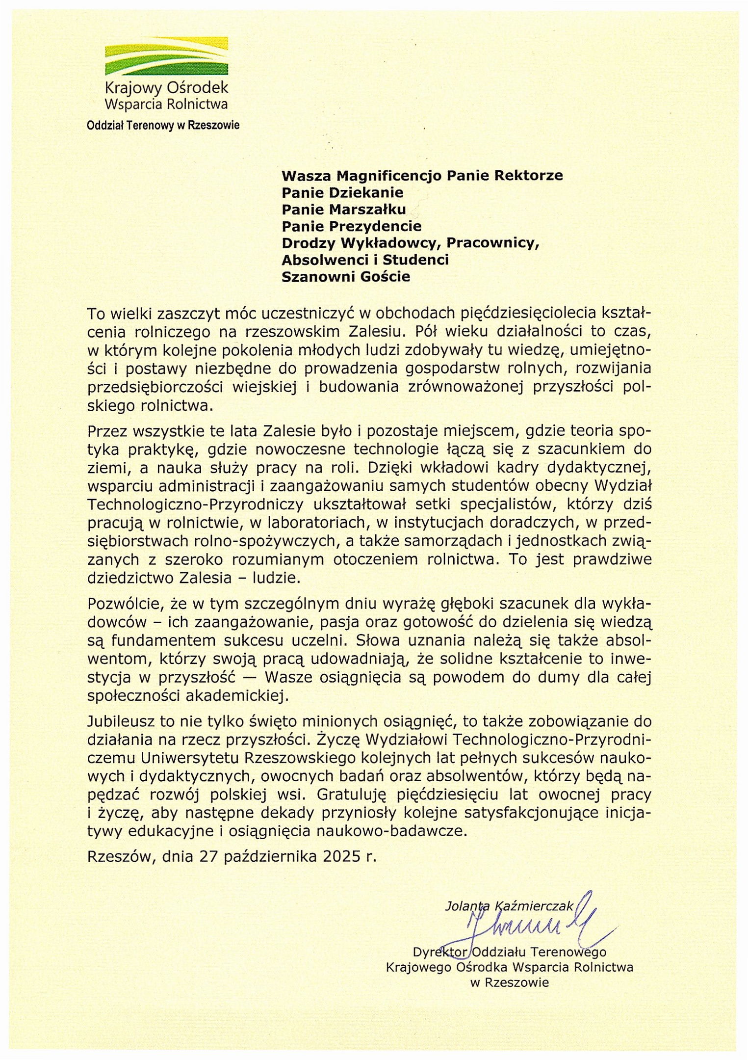 27 października 2025 roku Wydział Technologiczno-Przyrodniczy Uniwersytetu Rzeszowskiego świętował wyjątkowy jubileusz – 50-lecie istnienia. Uroczystość była okazją do wspomnień, podsumowań i refleksji nad bogatą historią jednostki, która od pół wieku stanowi ważne centrum rozwoju nauk przyrodniczych i rolniczych na Podkarpaciu.