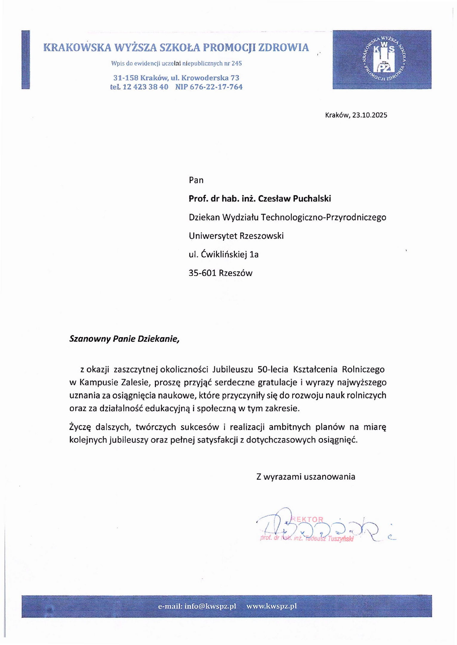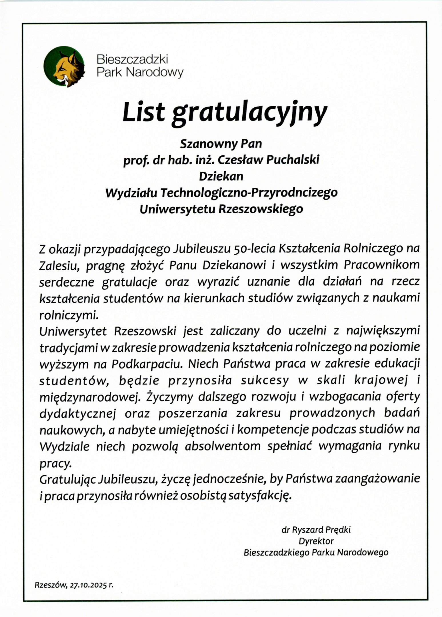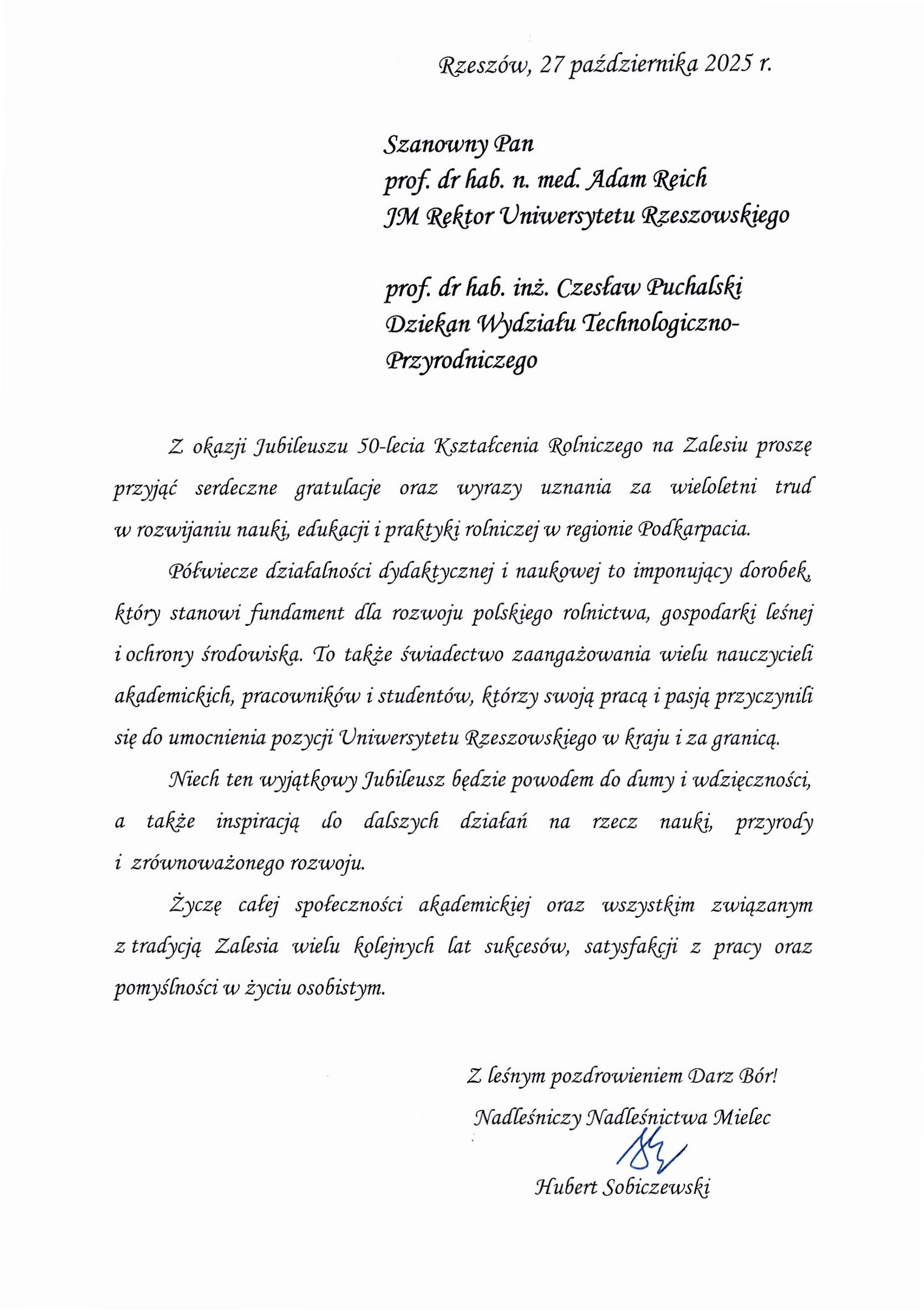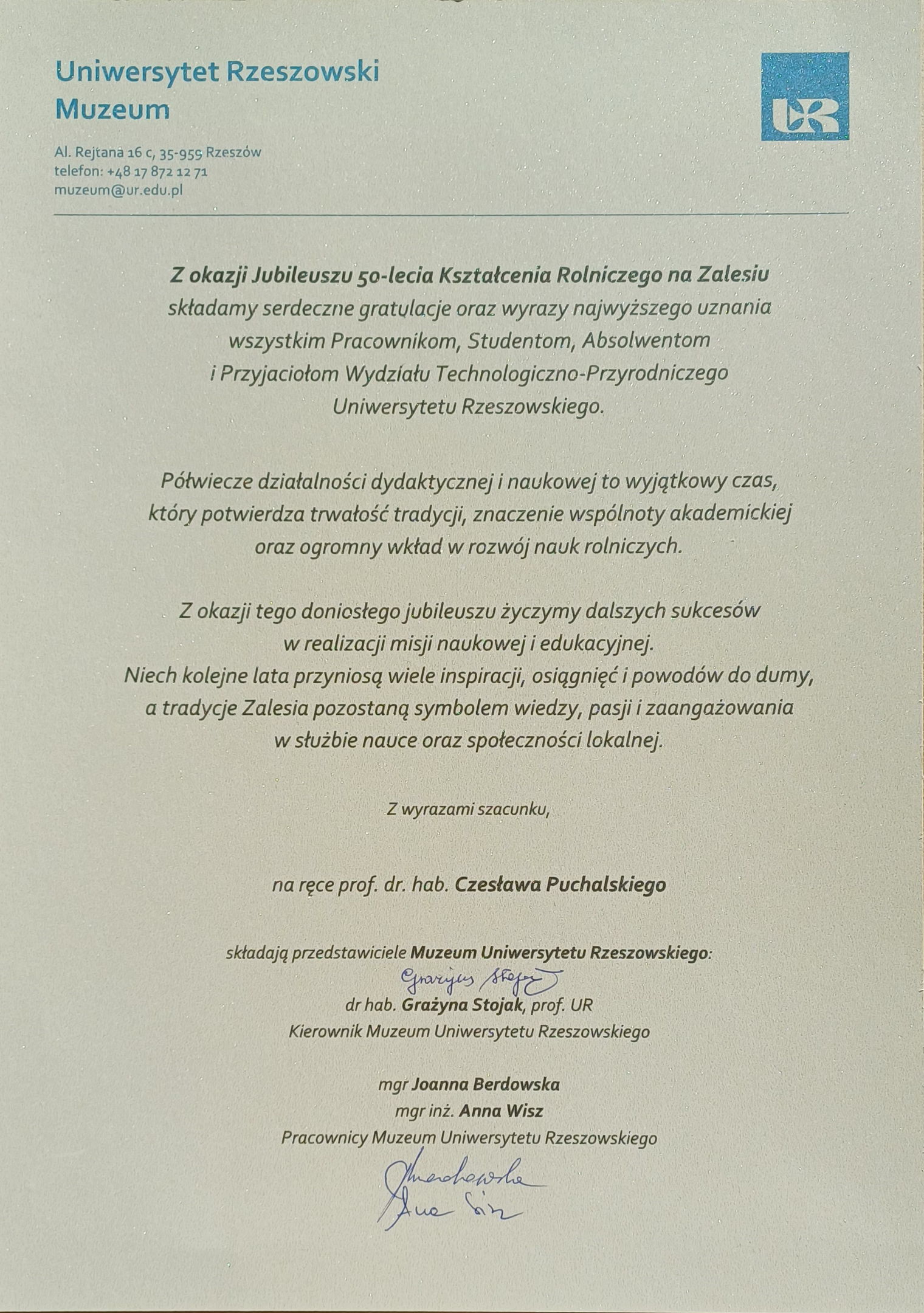 27 października 2025 roku Wydział Technologiczno-Przyrodniczy Uniwersytetu Rzeszowskiego świętował wyjątkowy jubileusz – 50-lecie istnienia. Uroczystość była okazją do wspomnień, podsumowań i refleksji nad bogatą historią jednostki, która od pół wieku stanowi ważne centrum rozwoju nauk przyrodniczych i rolniczych na Podkarpaciu.