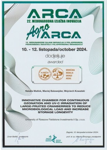 Pracownicy Uniwersytetu Rzeszowskiego zdobyli medal na Międzynarodowej Wystawie Wynalazków ARECA 2024 w Chorwacji. Zespół naukowców z Uniwersytetu Rzeszowskiego, w składzie dr hab. inż. Natalia Matłok, prof. uczelni oraz prof. dr hab. Maciej Balawejder prezentując wynalazek stanowiący komorę do ciągłego procesu ozonowania i irradiacji promienieniem UV-C owoców żurawiny wielkoowocowej celem zwiększenia trwałości w łańcuchu dostaw został nagrodzony przez międzynarodowe jury medalem. Wynalazek ten powstał jak rezultat projektu realizowanego w ramach programu WSPÓŁPRACA z PROW z konsorcjum z Oryginał Food Sp. z o.o. oraz Fileldstone Investments II Sp. z o.o.