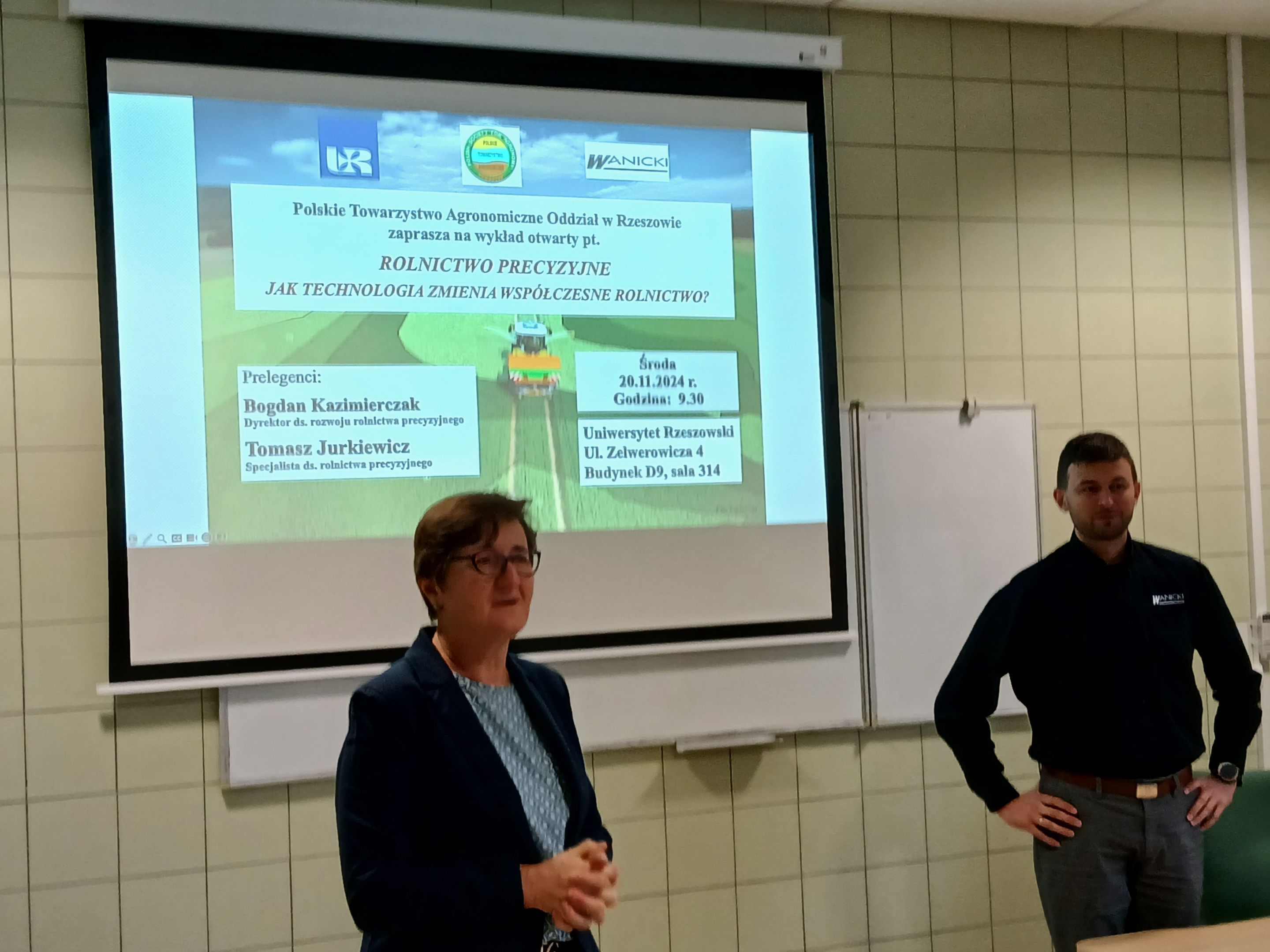 W dniu 20 listopada 2024 r. odbył się wykład otwarty pt. Rolnictwo precyzyjne. Jak technologia zmienia współczesne rolnictwo, prowadzony przez Pana Bogdana Kazimierczaka - Dyrektora ds. rolnictwa precyzyjnego firmy WANICKI. Organizatorem wydarzenia było Polskie Towarzystwo Agronomiczne (PTA) Oddział w Rzeszowie. W spotkaniu wzięli udział pracownicy i studenci Uniwersytetu Rzeszowskiego.