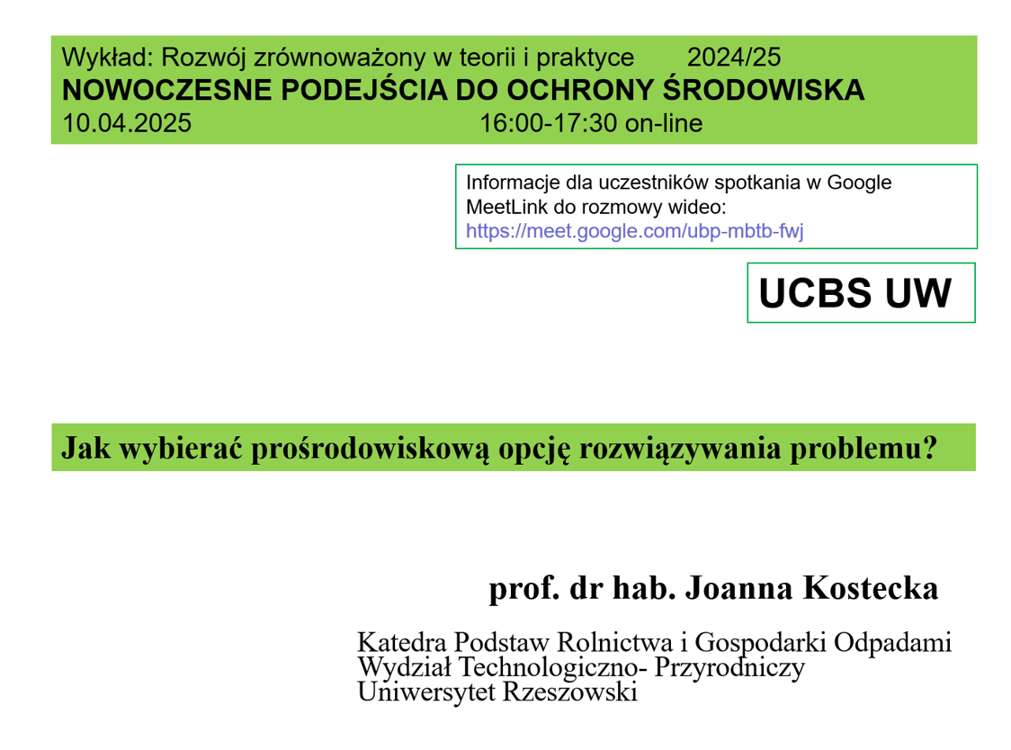 As part of the cooperation between academic centers, Professor Joanna Kostecka from the Faculty of Technology and Life Sciences of the University of Rzeszów was invited to give a lecture at the University of Warsaw in the summer semester of 2024/25. The lecture “How to choose an environmentally friendly option to solve a problem?” was attended not only by UW students (since it is an university-wide lecture), but also by teachers from the Mazovian Self-Governmental Teacher Training Center and all those interested in the topic. The lecture took place online on April 10, 2025 and was part of this year's series: Sustainable development in theory and practice (2024/25) - MODERN APPROACHES TO ENVIRONMENTAL PROTECTION.